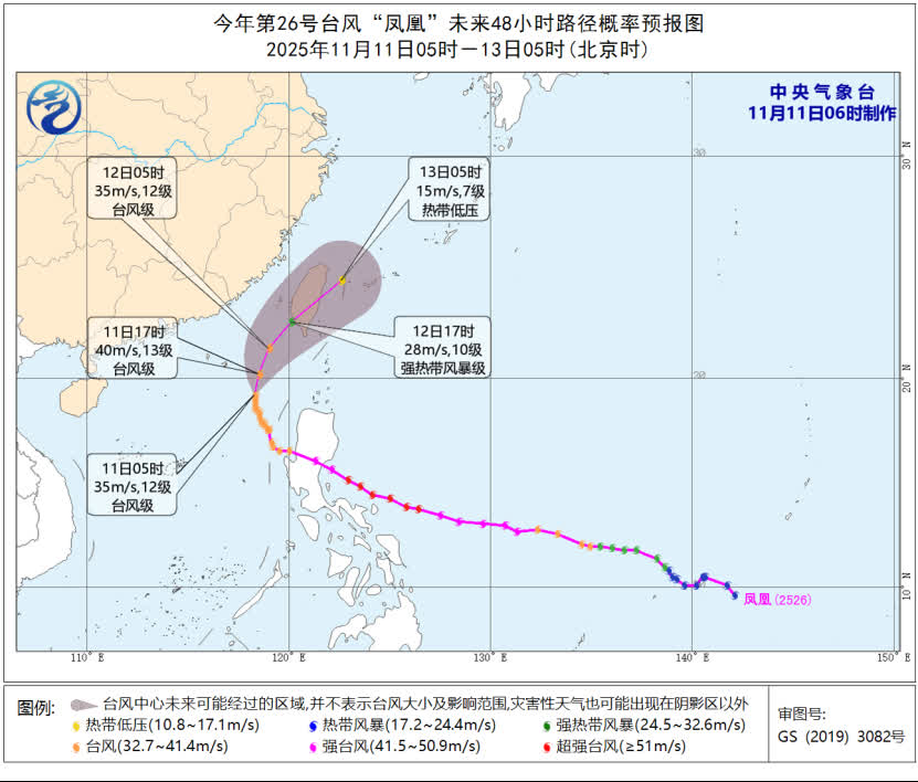 中央氣象台11月11日6時繼續發布颱風黃色預警:今年第26號颱風「鳳凰」的中心今天(11日)早晨5:00位於台灣島鵝鑾鼻西南方約400公里的南海東北部海面上,就是北緯19.2度、東經118.3度,中心附近最大風力有12級(35米/秒),中心最低氣壓為970百帕,七級風圈半徑380—480公里,十級風圈半徑180—220公里,十二級風圈半徑80公里。