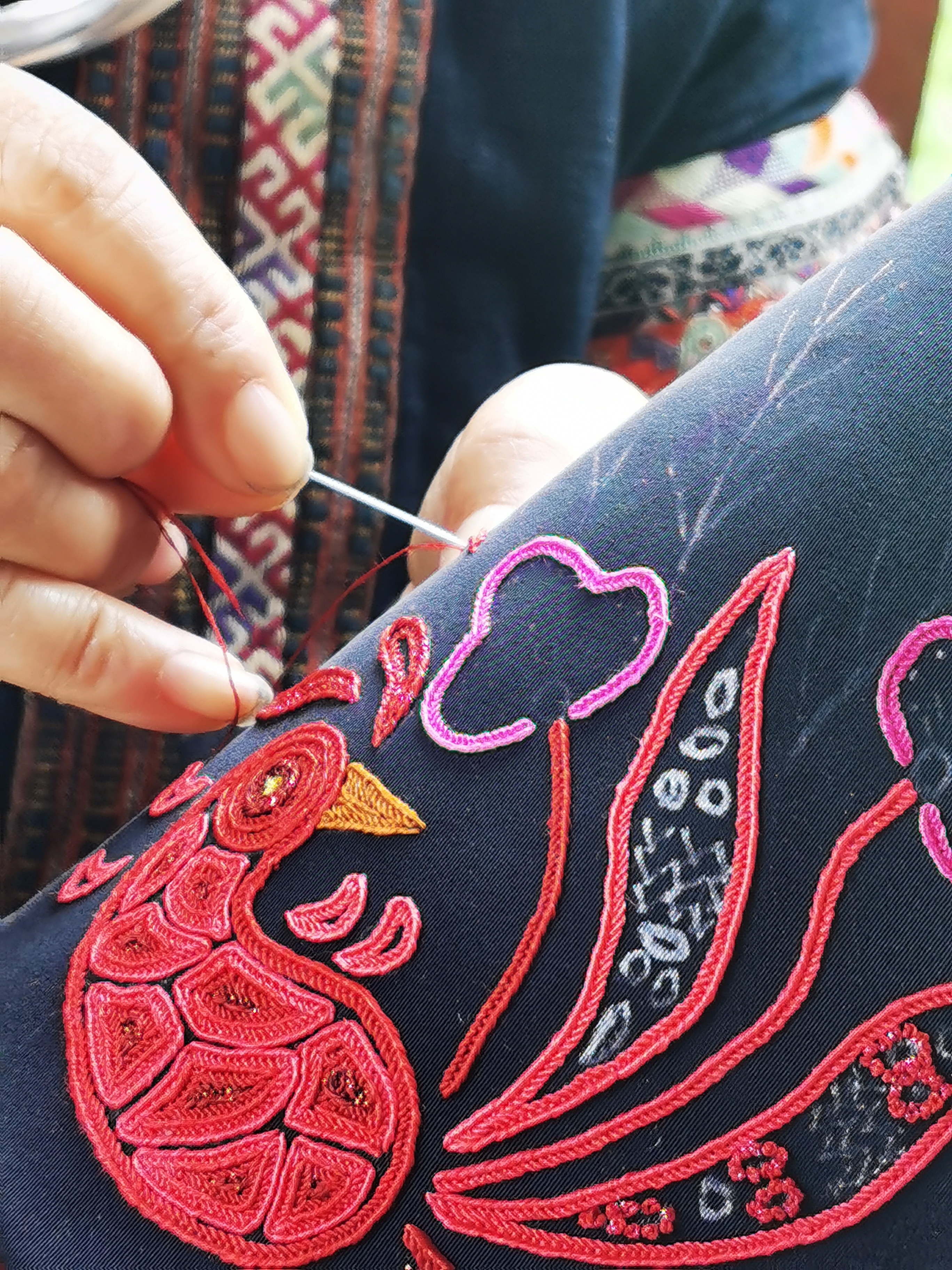 繡娘任永敏的工作室成了我們重點拍攝的對象。她正在將傳統苗繡與現代設計相結合,創作出充滿詩意的文創產品。"這個'花木深藏吊腳樓'系列的刺繡作品,最近接到了上海客戶的訂單。她手中的銀針在土布上游走,不僅繡出了傳統紋樣,更繡出了鄉村振興的新希望。快門聲此起彼伏,我們試圖用鏡頭捕捉這傳統與現代交融的瞬間。