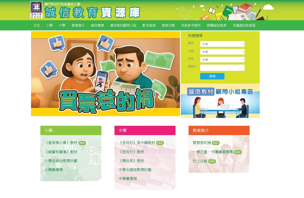 “誠信教育資源庫” https://app.ccac.org.mo/educations/ 除提供不同學科的誠信教案外,還備有誠信微課、兒童誠信故事、影音素材、刊物及德育活動等多元教學資源,為教育工作者的誠信教學或家長的親職品德教育提供多元化選擇和支援。