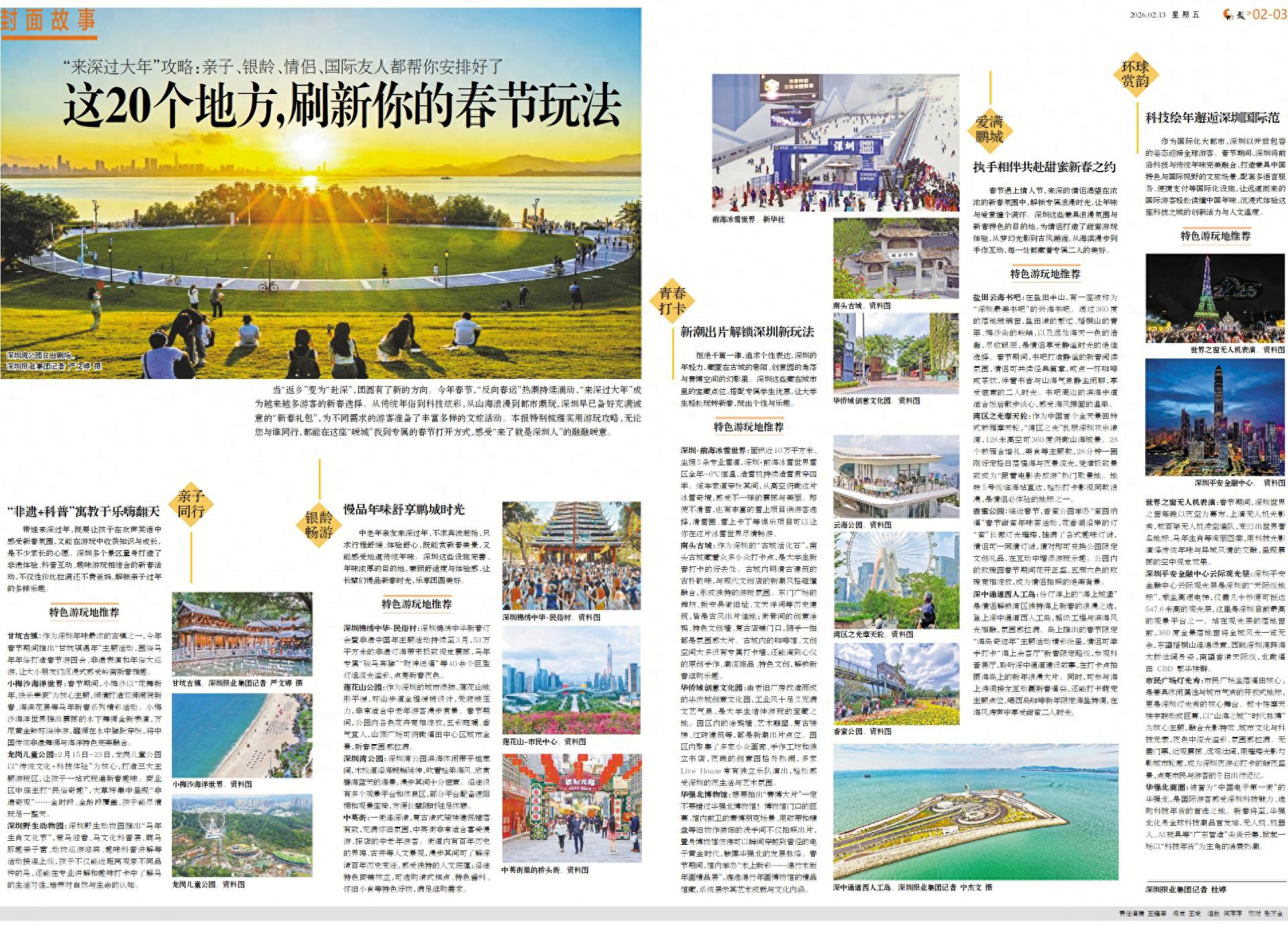 当“返乡”变为“赴深”,团圆有了新的方向。今年春节,“反向春运”热潮持续涌动,“来深过大年”成为越来越多游客的新春选择。从传统年俗到科技炫彩,从山海浪漫到都市潮玩,深圳早已备好充满诚意的“新春礼包”,为不同需求的游客准备了丰富多样的文旅活动。本报特别梳理实用游玩攻略,无论您与谁同行,都能在这座“暖城”找到专属的春节打开方式,感受“来了就是深圳人”的融融暖意。