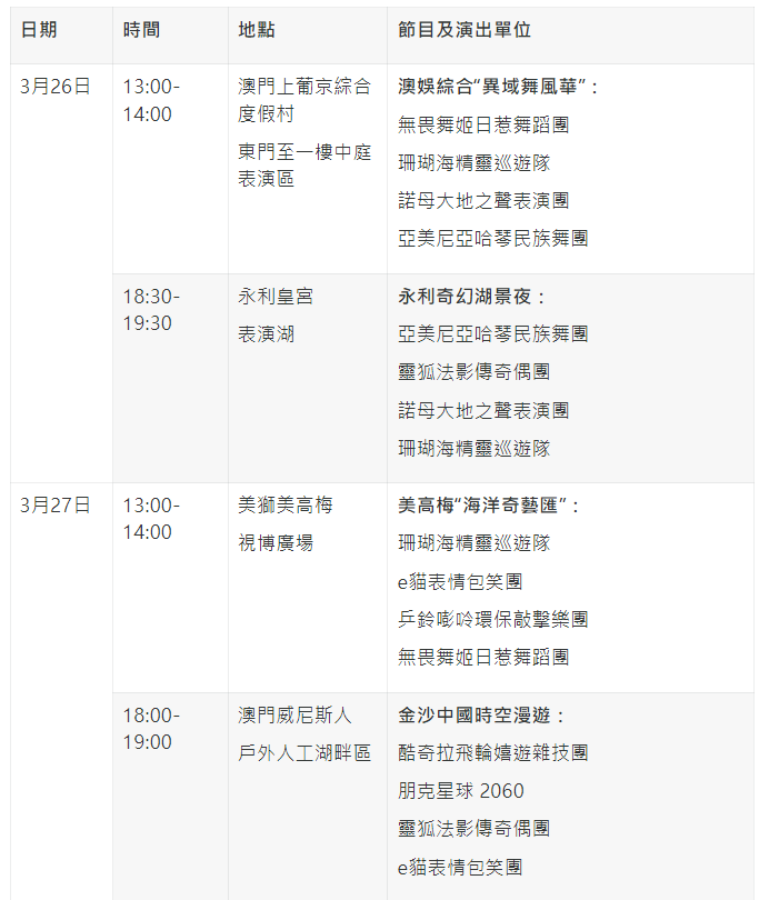 3月26日,澳娛綜合度假股份有限公司將於澳門上葡京綜合度假村東門至一樓中庭表演區呈獻“異域舞風華”,誠邀印尼、亞美尼亞及莫桑比克傳統舞蹈團傾情演出,聯同絢麗奪目的海洋主題造型巡遊隊,一同呈現多元的異域文化風采;同日,澳門永利渡假村將在永利皇宮表演湖上演“永利奇幻湖景夜”,亞美尼亞、莫桑比克傳統舞蹈齊聚,法國狐仙高蹺與海洋生物隊華麗登場,展現跨國文化藝術交融之美。