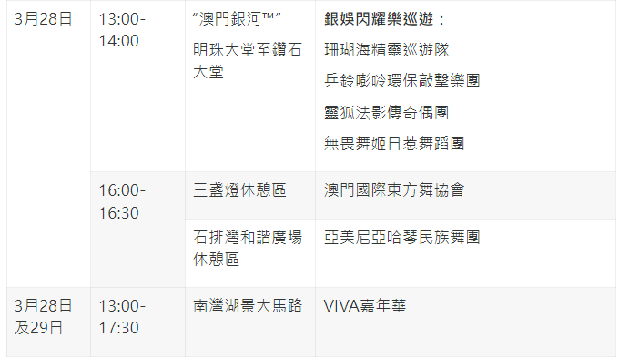 3月28日,銀河娛樂集團將於“澳門銀河™”綜合度假城的明珠大堂至鑽石大堂帶來“銀娛閃耀樂巡遊”,來自法國的珊瑚海精靈巡遊隊及靈狐法影傳奇偶團,以及印尼無畏舞姬日惹舞蹈團與葡萄牙乒鈴嘭唥環保敲擊樂團攜手共築奇幻盛宴。同日下午,“文化多點‧幸福多點”延伸演出繼續走進社區,“澳門國際東方舞協會”將於三盞燈休憩區帶來色彩繽紛的少兒舞蹈演出,以童真舞姿綻放活力與歡笑;而被列為亞美尼亞十大國家級舞蹈團的“亞美尼亞哈琴民族舞團”,將於石排灣和諧廣場休憩區帶來精彩的亞美尼亞傳統民族舞蹈表演。