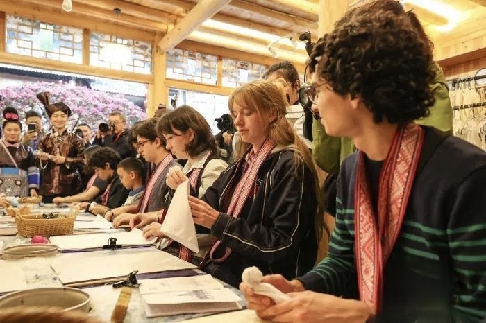 走进侗寨,耶鲁学子们开启了一场深度文化体验之旅。在侗族文化展示中心,他们了解了侗族建筑与服饰的历史和其独特的魅力;在蜡染工坊,成员们手持蜡刀,亲手感受这项古老技艺的温度,一位成员还兴奋地展示了自己制作的蜡染作品。在信团鼓楼前,他们体验了打糍粑的乐趣,将欢乐“捶”进食物;在仁团鼓楼的火塘边,学子们与侗族乐器传承人陆东辉围坐交流,即兴学习牛腿琴、侗族琵琶等传统乐器。“饭养身、歌养心” 这句侗家俗语给成员们留下了深刻印象,成员Peighton感叹道:“这是一句很美的话。没有音乐,但我不知道如何养心。