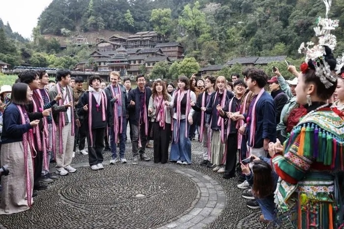 创建于1909年的耶鲁大学Whiffenpoofs合唱团,是全球历史最悠久的阿卡贝拉合唱团,1985年曾应邀首次访华,此次中国行是其中国巡演40周年的纪念之旅。而已有超过2500年历史的侗族大歌,2009年被联合国教科文组织列入人类非物质文化遗产代表作名录,被誉为 “东方最古老的阿卡贝拉” 。此次活动的中国行团长张艺潇表示:“侗族大歌传承着侗族文化,不仅仅是演唱,还是一个历史画卷的展示和完美的演绎。希望耶鲁大学的同学们可以深入了解中国文化的多元和绚丽。”苗族青年学者、黔东南州黄岗侗寨荣誉村长谢宗旭博士说:“国之交在于民相亲,此次将侗族大歌作为中美民间友好交往的特色载体,以音乐为窗口进行中美两国青年及人民之间的对话,是中美民间文化交流实践的生动体现。”两天的交流活动中,耶鲁学子与侗族歌师在鼓楼下围炉对歌,在篝火旁分享生日祝福,在天生桥下聆听和声与大自然的共鸣。恰逢合唱团一位成员生日,村歌团用侗语唱响生日快乐歌,歌声与笑声交织,友谊在这一刻变得具体而温暖。