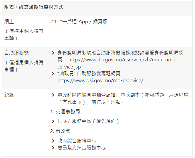為方便市民繳交行車稅,交通事務局持續提供多元化的繳交渠道。於4至5月期間,個人持有車輛之車主仍可透過“一戶通”App/網頁版、身份證明局多功能自助服務機、“澳政易”自助服務機、親臨交通事務局或市政署指定櫃檯(詳見附表),一次過繳清稅款、相關罰款及其他費用;而公司持有的車輛則需親臨繳交。