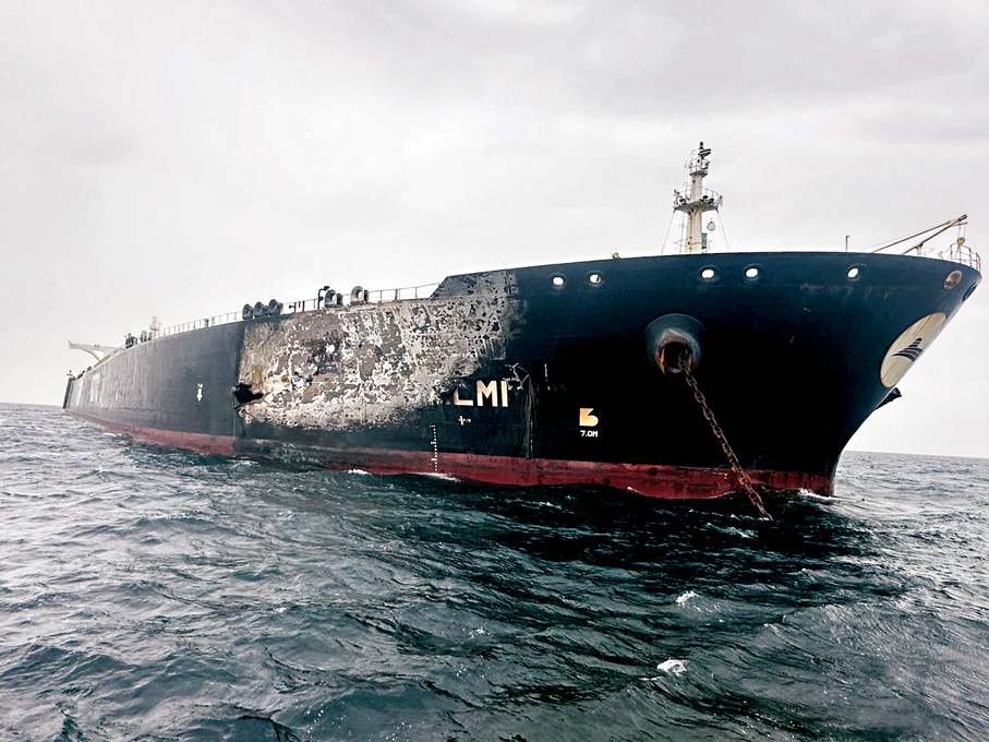 ●一艘懸掛科威特旗幟的油輪在阿聯酋迪拜港口遭伊朗無人機襲擊,船身嚴重損毀。 路透社