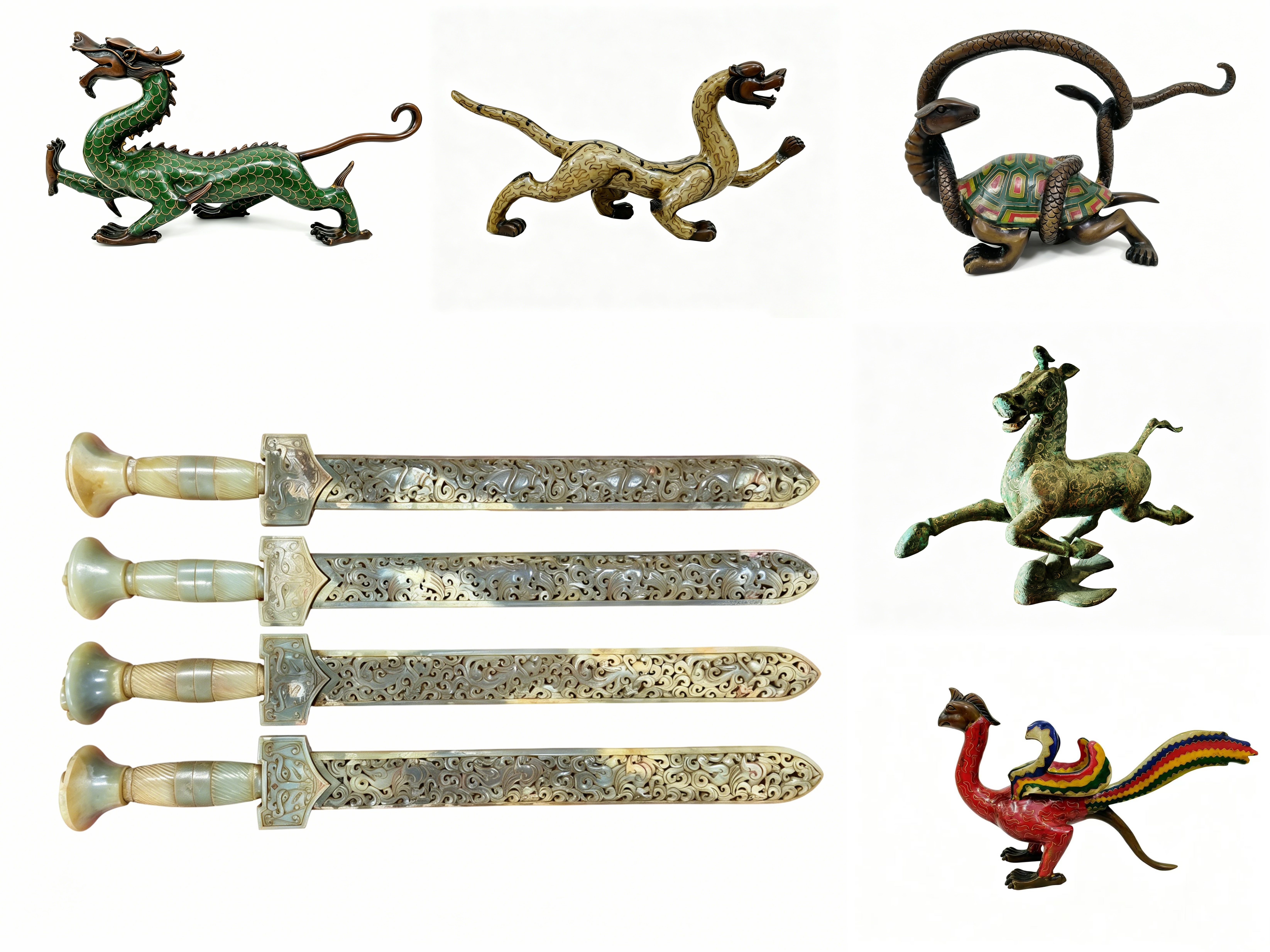 展览馆内,青铜器、陶瓷器、金银器、玉石器、中国书画,品种繁多,琳琅满目。其中,不仅有象征马年吉祥的战国青铜器马踏飞隼、汉代青铜器天龙水马(龙马精神),还有战国和田玉凤还巢、战国岫岩玉鹰熊摆件与一大批体现唐代非物质文化遗产的鎏金錾刻金银器,诸如唐代錾刻鎏金五更三足盅、唐代鎏金镶宝龙凤灯盏,令人目不睱接。其中,最吸引人眼球的莫过于宋徽宗、齐白石、傅抱石等大师的书画珍品与四尊清代铜胎掐丝珐琅青龙、白虎、朱雀、玄武摆件。