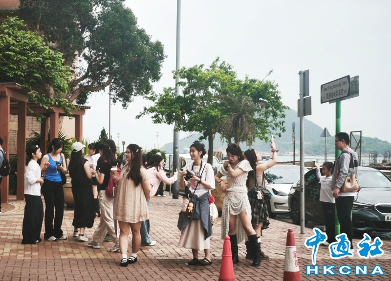 圖為訪港遊客在堅尼地城新海旁打卡拍照。香港中通社圖片