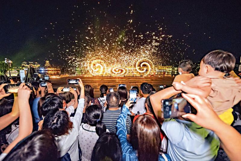 非遗表演「打铁花」是铜官窰古镇游客赞不绝口的经典演出,据相关负责人表示,国庆期间增加了表演人员、扩大演出场地,对非遗表演打铁花进行升级改造,为观众呈现更加震撼人心的美!