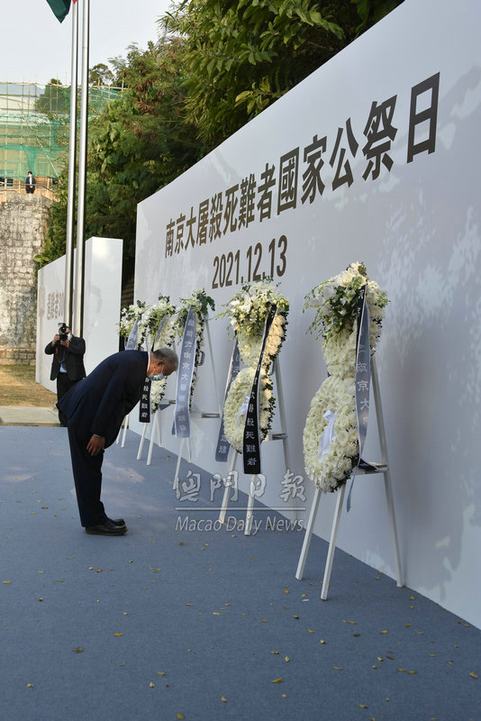 【澳門日報消息】十二月十三日為南京大屠殺死難者國家公祭日,特區政府於上午九時在路環保安部隊高等學校操場舉行公祭悼念儀式。行政長官賀一誠、全國政協副主席何厚鏵、澳門中聯辦主任傅自應、外交部駐澳公署特派員劉顯法、解放軍駐澳部隊司令員徐良才、以及本澳主要官員和社會各界人士等三百多人出席公祭儀式。