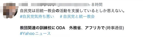 有人批评称,“这只会被看作自民党在支援统一教的活动”,并附上了“自民党恶心”等标签。