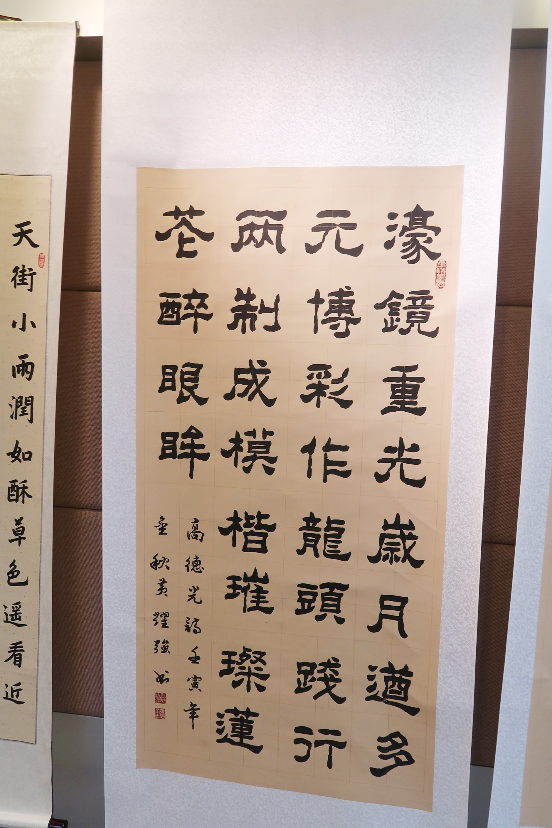 澳门书法院副院长温子成亦展出多个书法作品,当中的扇面竹刻作品描绘了一幅传统水墨画,扇骨上的书法也使用了多种雕刻手法。他表示,扇面通过水和墨的不同比例变化,使之产生或浓或淡或虚或实的意境效果。利用水与墨的交融,在浓淡之间彰显了层次的变化,在黑白之间表现了色彩的缤纷。在创作过程中以线条为骨,兼工带写,变浊为清,其书清秀,其诗清趣,其画清逸,其意清新,展现了古代文人的优雅趣致。