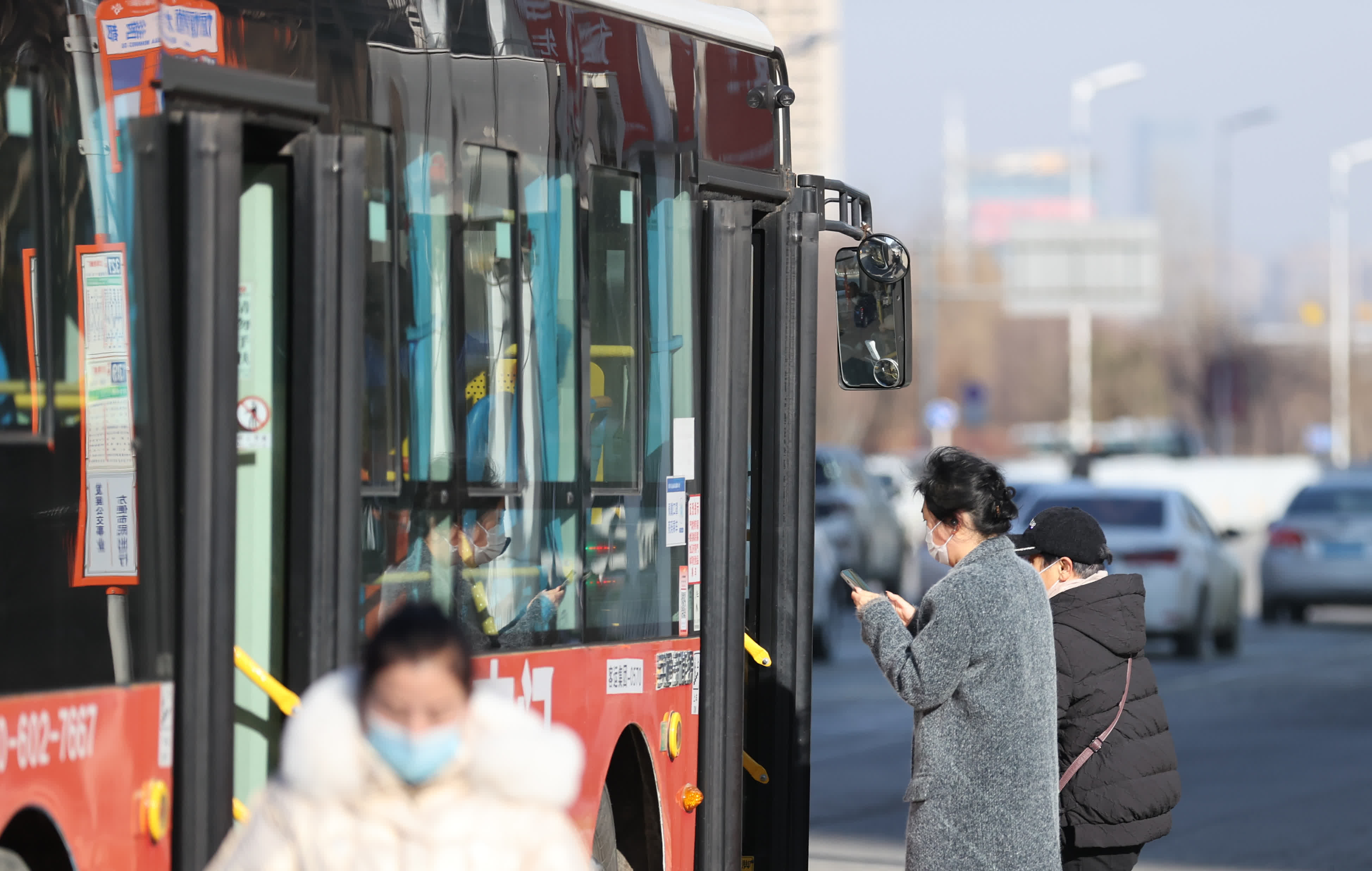 交通運輸部刪除了對跨區域出行人員查驗核酸檢測陰性證明、健康碼和「落地檢」有關要求。圖為遼寧瀋陽市民乘公交車出行。(中新社)