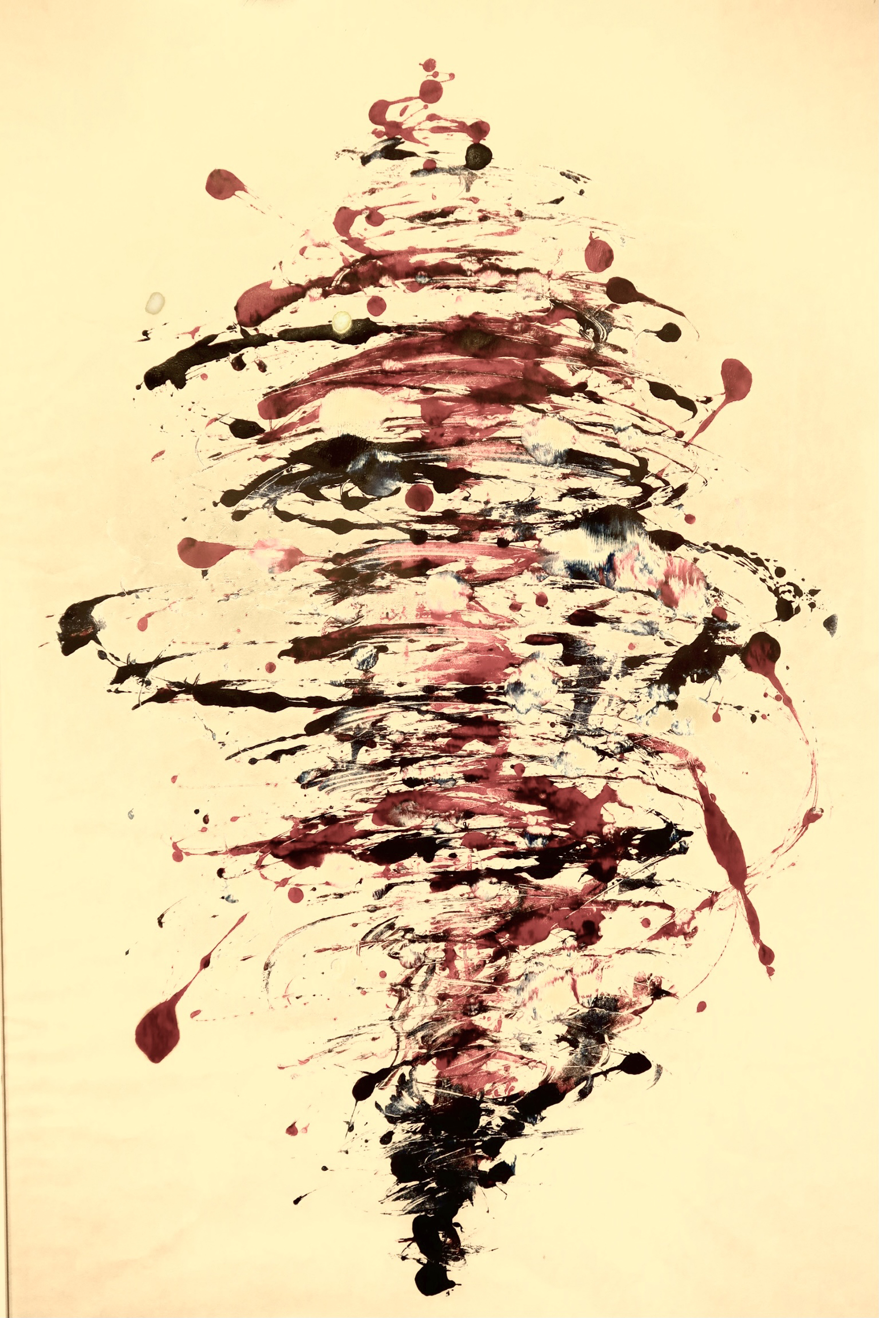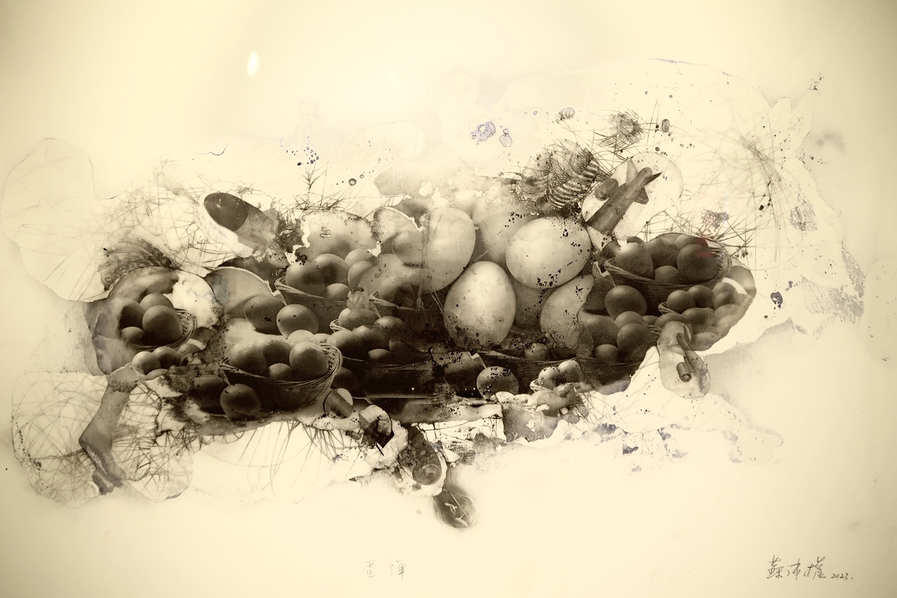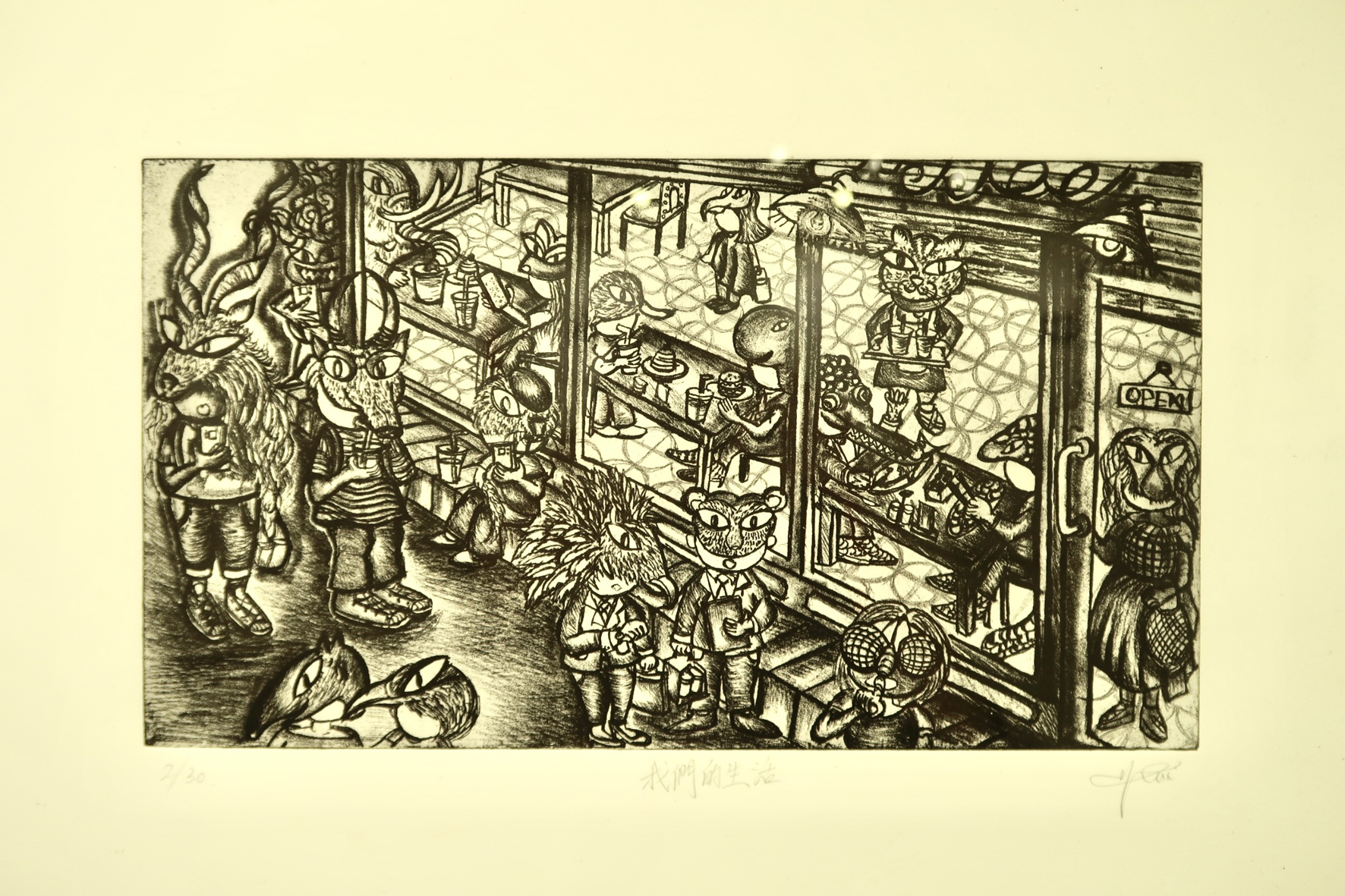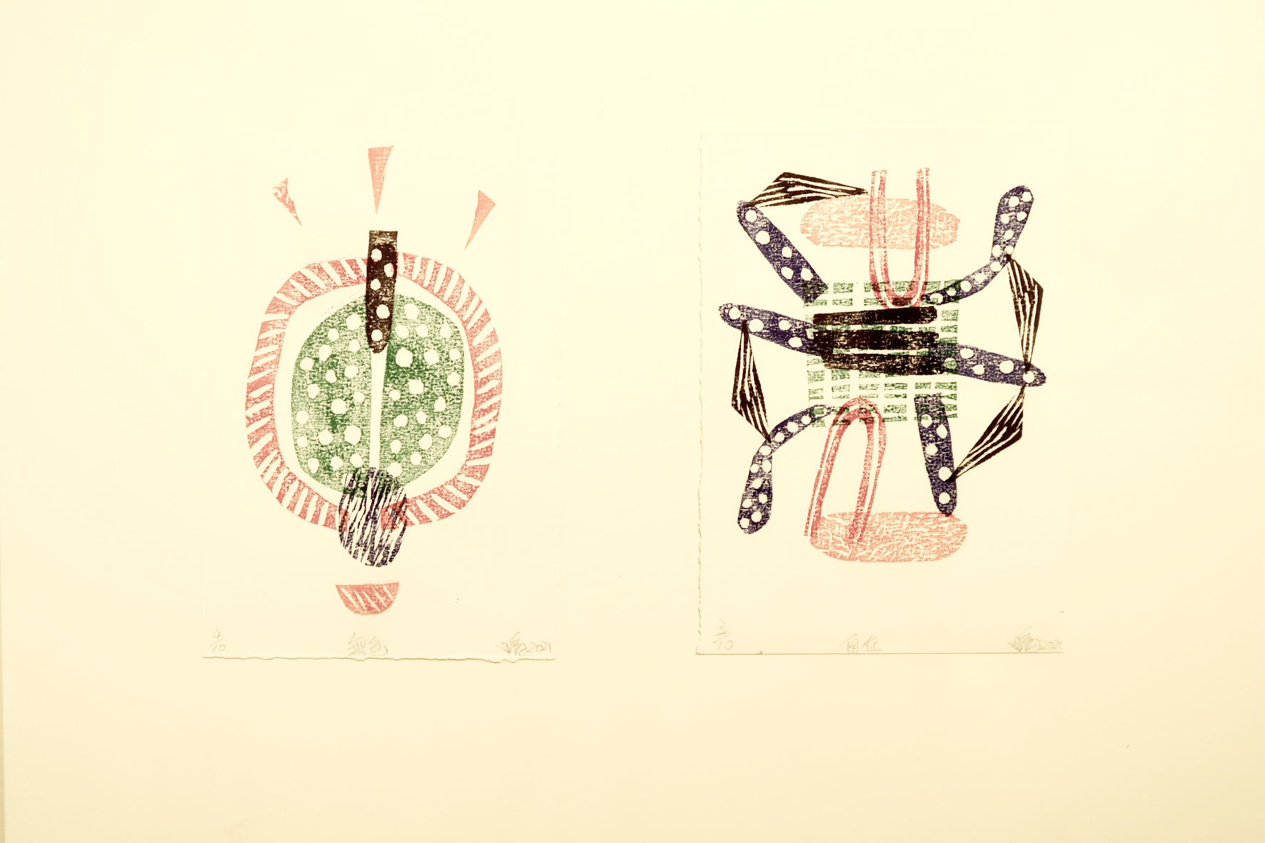版画是一种可复制的艺术媒体,比绘画更利于交流,能让更多人同时异地观赏到原作,澳门创作性的版画在二十世纪八十年代末开始萌发,至今经历三十多年,逐渐树立起以凹版为主轴的版画创作路线。陈伟浩的作品《门神》印刷在描金红纸上,配以抽象的一对传统门神。在传统中国文化中,门神是木版年画的主要题材之一,陈伟浩在传统门神的基础上进行创新,泼洒黑色和白色墨水与宣纸上,将两位门神紧密相连。而黄慧仪的作品《我们的生活》描绘了一幅不同种族的生物在餐厅就餐的画面,创作中使用了腐蚀法,这需要创作者首先在金属版画表面涂上防腐蜡,刻划出想要的图案后,再用酸性腐蚀液腐蚀。印刷时将油墨填入凹线中,并拭去版书上多余的油墨,通过滚筒的压力,使凹线中的油墨印到纸上去,形成纤细而层次丰富的艺术效果。苏沛权是次展出版画作品《蛋弹》,除了鸡蛋元素外,还有火箭、旗帜等元素。苏沛权受访表示,此作品是以时事作为灵感创作,但具体传达的内容,需要观众自行体会,因为每个人对于艺术元素的理解不同,艺术家的任务只是完成创作,而理解则需观众完成。苏沛权除了在版画上颇有建树外,在陶瓷方面亦有丰富的经验。问及陶瓷艺术和版画之间的联系,他认为两者在创作过程中有相同之处,例如版画是将印花转印,而陶瓷上的图案亦可以考虑相同方法进行转印。他续表示,随著科技的发展和印刷技术的创新,版画亦源源不断出现新的表现形式。是次展出的作品中,他运用了透明的指甲油在版画上描绘,呈现出反光、清透的质感,未来会继续致力研究各种不同媒材和创作手法,在版画上作出更多创新。