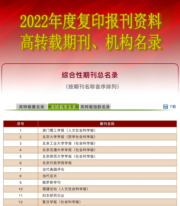 2022年度複印報刊資料高轉載期刊名錄由中國人民大學書報資料中心根據人大複印資料近100種學術刊的全文轉載數據,從轉載量、轉載率、綜合指數三個維度統計形成。複印報刊資料系列刊是從國內公開出版的近4,000種報刊上精選人文社會科學研究成果,並按人文社科二級學科進行分類、編輯、出版的二次文獻。