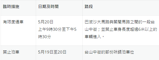 澳门头条讯:配合市政署維修井蓋,台山中街5月19日(周五)至20日(周六)實施臨時交通管制措施,詳情可查閱附表。期間部份巴士路線需改道行駛,但停靠站點不受影響,詳情可留意澳巴https://www.tcm.com.mo及新福利網站https://www.transmac.com.mo。