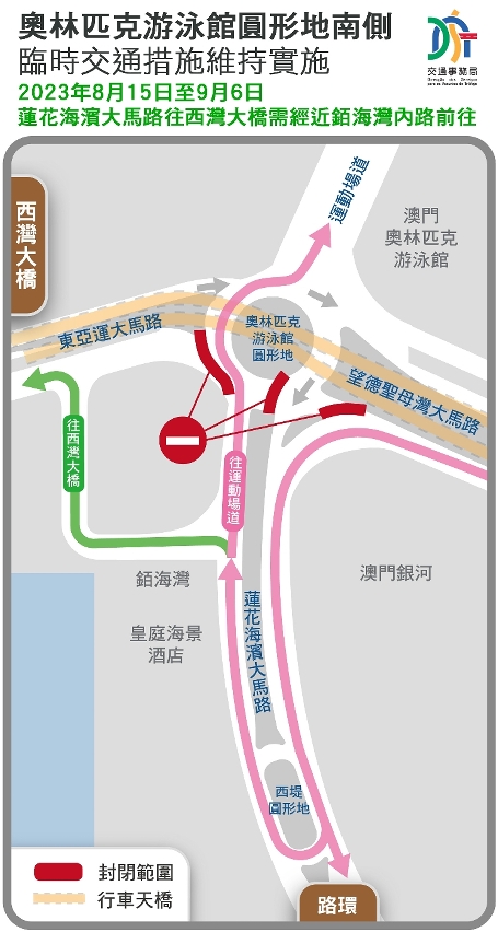 澳门头条讯:配合奧林匹克游泳館圓形地行車天橋西南匝道橋建造工程推進,需要拆卸圓形地臨時鋼平台。由8月8日(周二)至9月6日(周三),臨時開放蓮花海濱大馬路近銆海灣位置左轉往東亞運大馬路之內路,供前往西灣大橋之車輛使用;並由8月15日(周二)起臨時封閉圓形地往東亞運大馬路之路口,屆時由蓮花海濱大馬路往西灣大橋之車輛,須經由上述內路駛至東亞運大馬路後按原路線前往,直至鋼平台拆卸工作完成後將恢復現有行車安排。