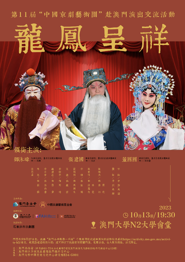 澳门头条讯:由澳門基金會及中國京劇藝術基金會主辦,澳門大學中國歷史文化中心協辦,“中國京劇藝術團”赴澳門演出交流活動載譽歸來!第11屆“中國京劇藝術團”赴澳門演出交流活動──京劇《龍鳳呈祥》將於2023年10月13日晚上7時半在澳門大學N2大學會堂隆重開演,並於9月27日起向公眾免費派發入場門票。