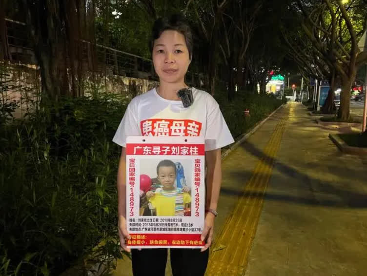 41歲的利學梅穿着定製的T恤衫站在尋親家屬中間,上面寫着「患癌母親」格外醒目。辭去工作尋子已有8年,她如今身患肺癌晚期、乳腺囊腫,頭部還有兩個腫瘤。