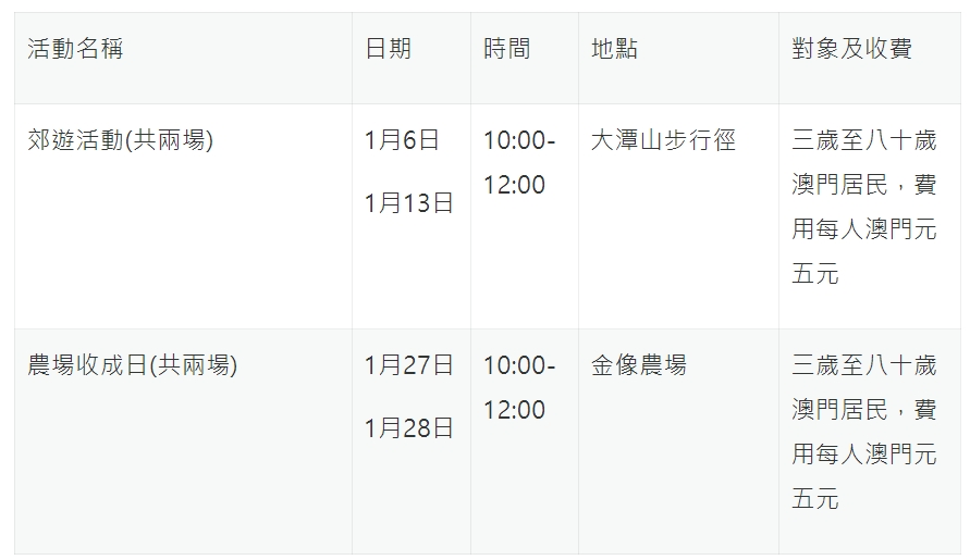 為提高市民的生態保育意識,推動公眾接觸大自然及認識本地動植物,市政署將於一月份舉辦多場親近大自然活動,適合一家大小參與,歡迎市民報名參加。