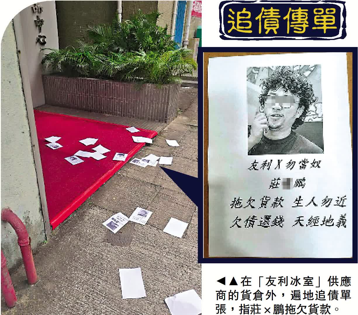 庄×鹏今年3月承认已累积亏损逾千万元,开始精简菜单,连招牌菜亦停止供应,企图减少亏损。不过他的变阵却令「友利」顾客越来越少,近日有网民上载「友利」供应商货仓门口一地追债传单的相片,传单上有庄×鹏的相片及姓名,大字标语「友利×勿当奴 拖欠货款 欠债还钱」。网上亦有爆料帖文,透露「友利冰室」拖欠数十万货款,包括米商及冻肉商;亦有帖文指荔枝角分店至少拖欠业主半年租金逾90万元,连同供应商货款及员工工资约共200万。