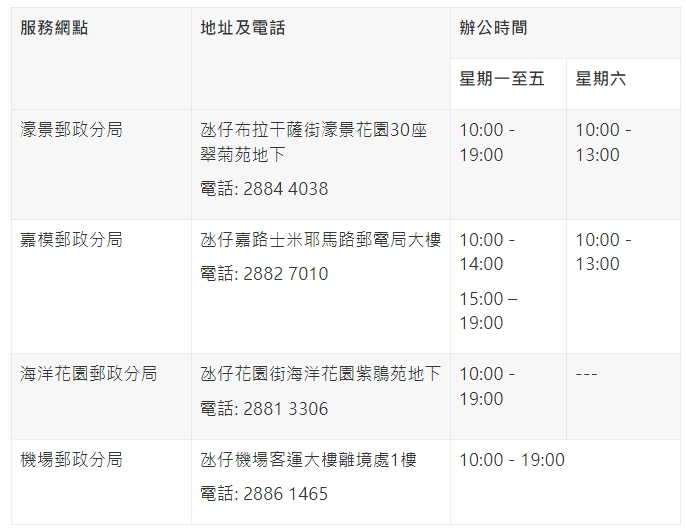 郵電局轄下之氹仔碼頭郵政分局將進行內部改造工程,自2024年9月12日起終止提供櫃檯服務;重開日期將另行通知。倘需使用郵政服務,請移玉步至下述郵政分局: