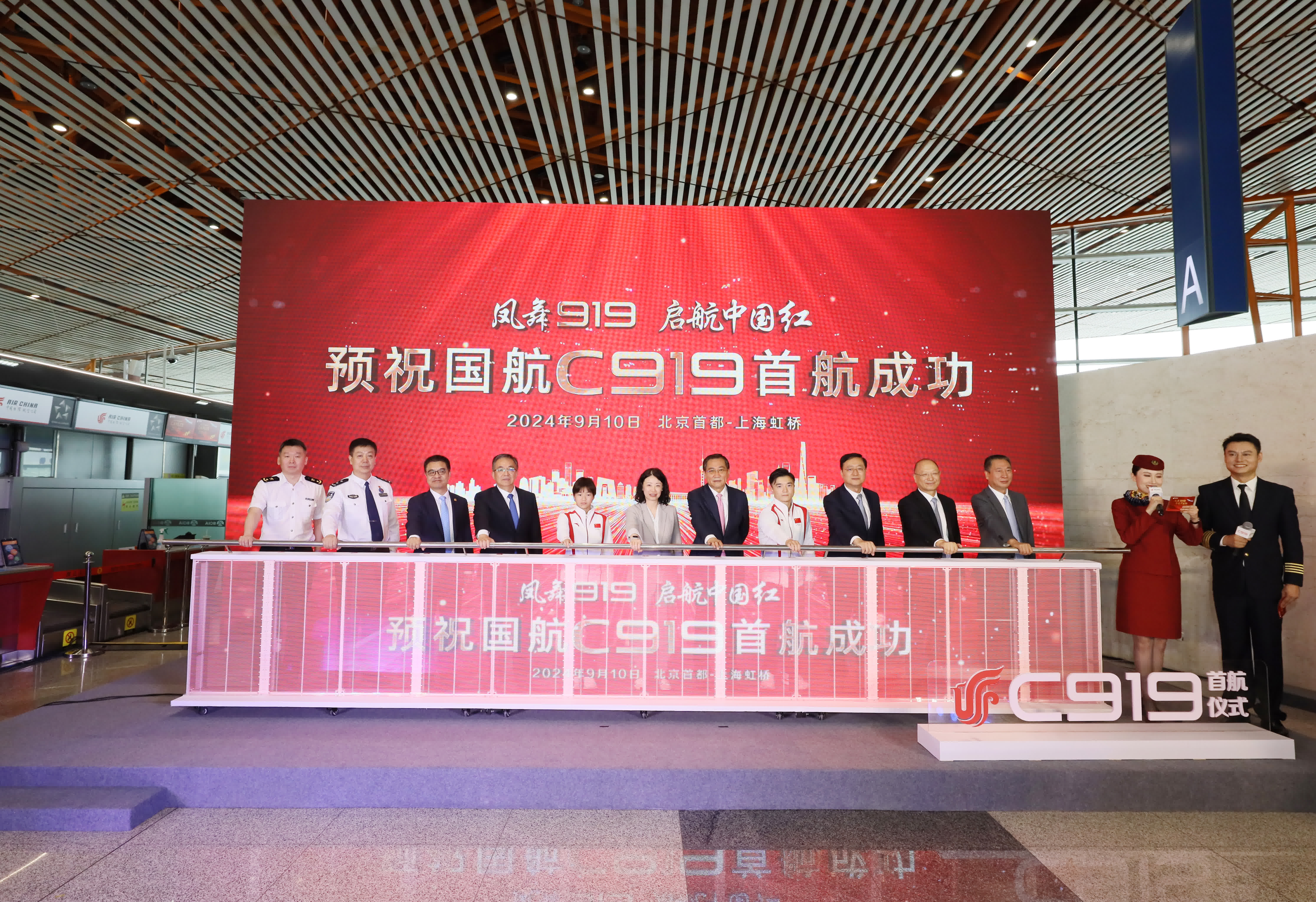 航班起飞前,国航在北京首都国际机场举行了首航仪式。仪式上,国航特别邀请了两航起义亲历者、国航飞行总队原总队长、中国民航第一代乘务员等老一辈民航工作者来到现场,共同观看影片《凤舞919 启航中国红》,并赠送国航C919机模作为纪念,以此致敬老一辈的辛勤付出。