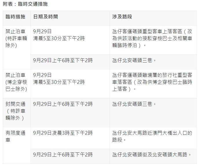配合體育局舉辦“齊賀澳門大橋開通健步行”活動,氹仔客運碼頭及周邊道路於9月29日(周日)凌晨3時至下午2時實施臨時交通措施(詳情可查閱附表);巴士服務方面,“北安出入境事務大樓”站於同日首班車起至下午2時臨時停用,乘搭51(往蝴蝶谷大馬路)及59(往聯生圓形地)路線的乘客,屆時可使用“氹仔客運碼頭”站。