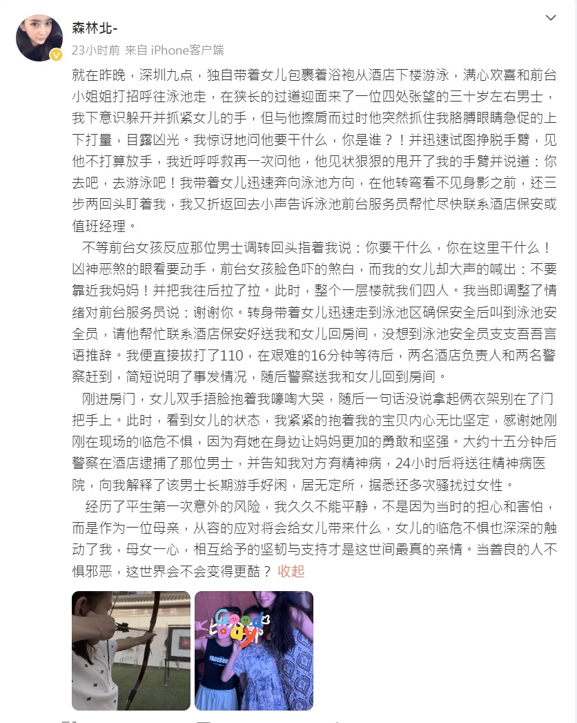 森林北在发文中忆述,10月5日晚上9点左右,在酒店带着女儿要下楼去游泳,经过狭长的过道时一名四处张望的三十岁左右男子迎面而来,“我下意识躲开并抓紧女儿的手,但与他擦肩而过时,他突然抓住我胳膊,眼睛急促地上下打量,目露凶光。”她试图挣脱,并大声呼救,男子见状后狠狠地甩开她的手臂,并对她说:“你去吧,去游泳吧!”