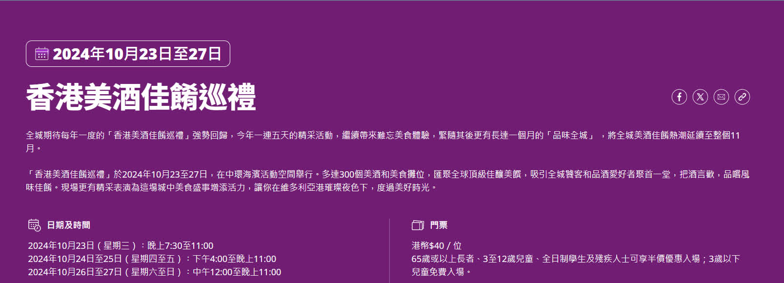 活动将于今晚7时半开放,明日和后日就会下午4时起开放,周末由中午12时起开放,晚上11时结束。市民可在指定网站购买入场门票,票价由20至40元不等。至于用作品酒的「品味通行证」,设有3个价位,访客可以以400元购买14张,或者以240元购买8张,也可以以290元,购买8张连纪念版酒杯。