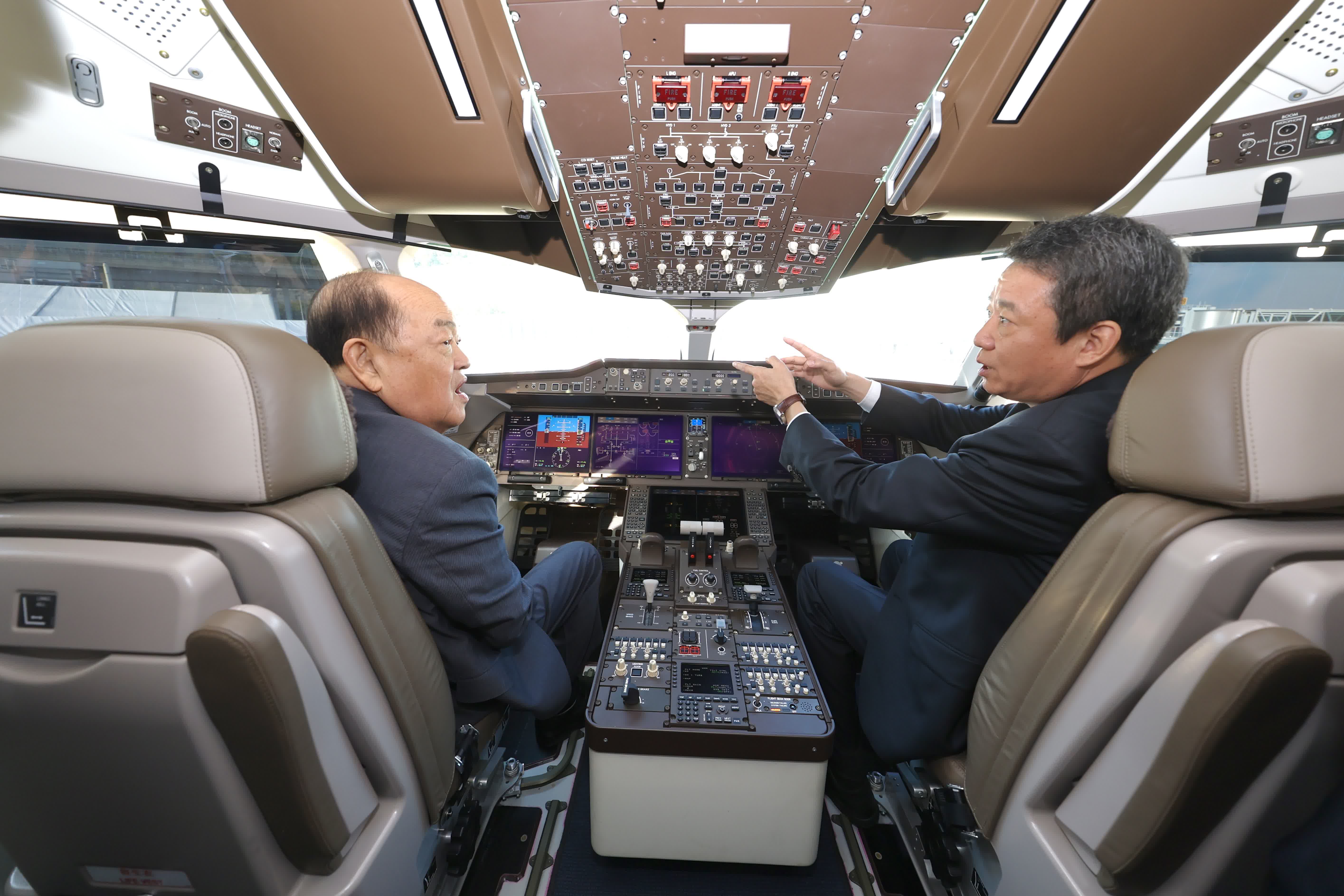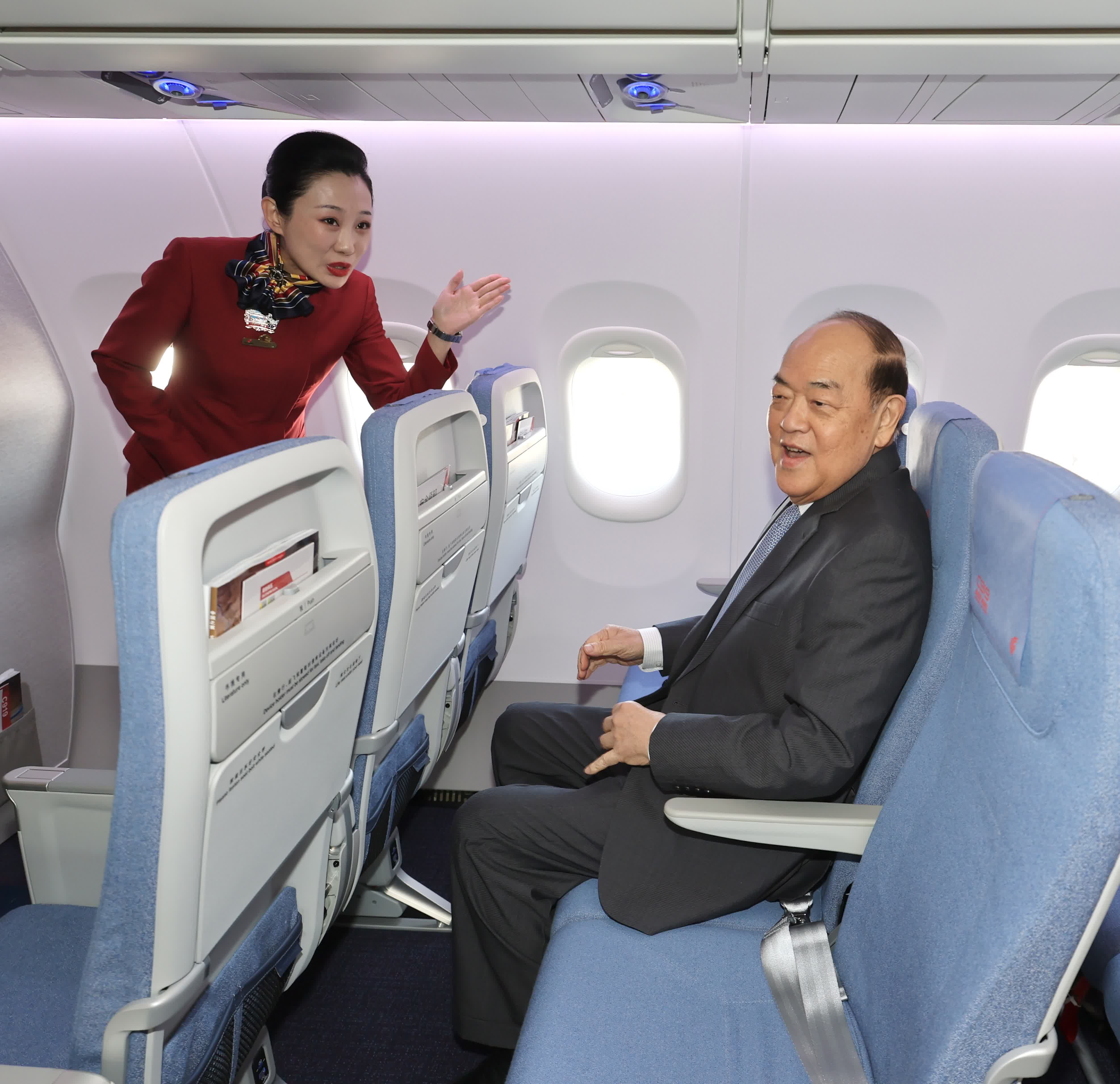 (香港文汇网记者王珏 北京报道)11月8日,身披五星红旗的国航B-919Y号国产大飞机亮相第十三届澳门公务航空展,向中华人民共和国成立75周年、澳门回归祖国25周年献礼。澳门特别行政区行政长官贺一诚在工务运输司司长罗立文、澳门民航局局长潘华健、中国航空集团有限公司董事崔晓峰、南光集团总经理姜维亮等陪同下登机参观,对国产大飞机给予高度赞赏。