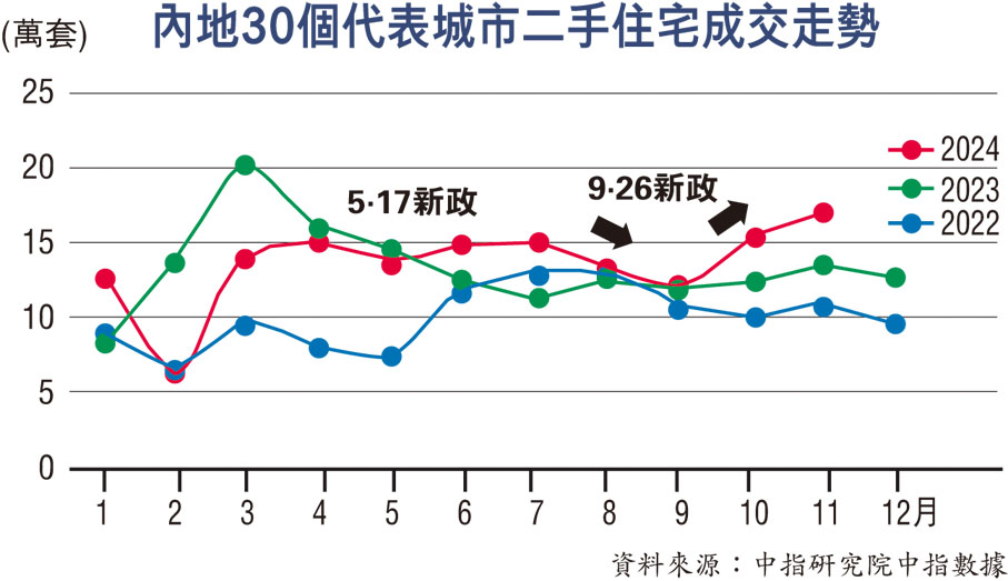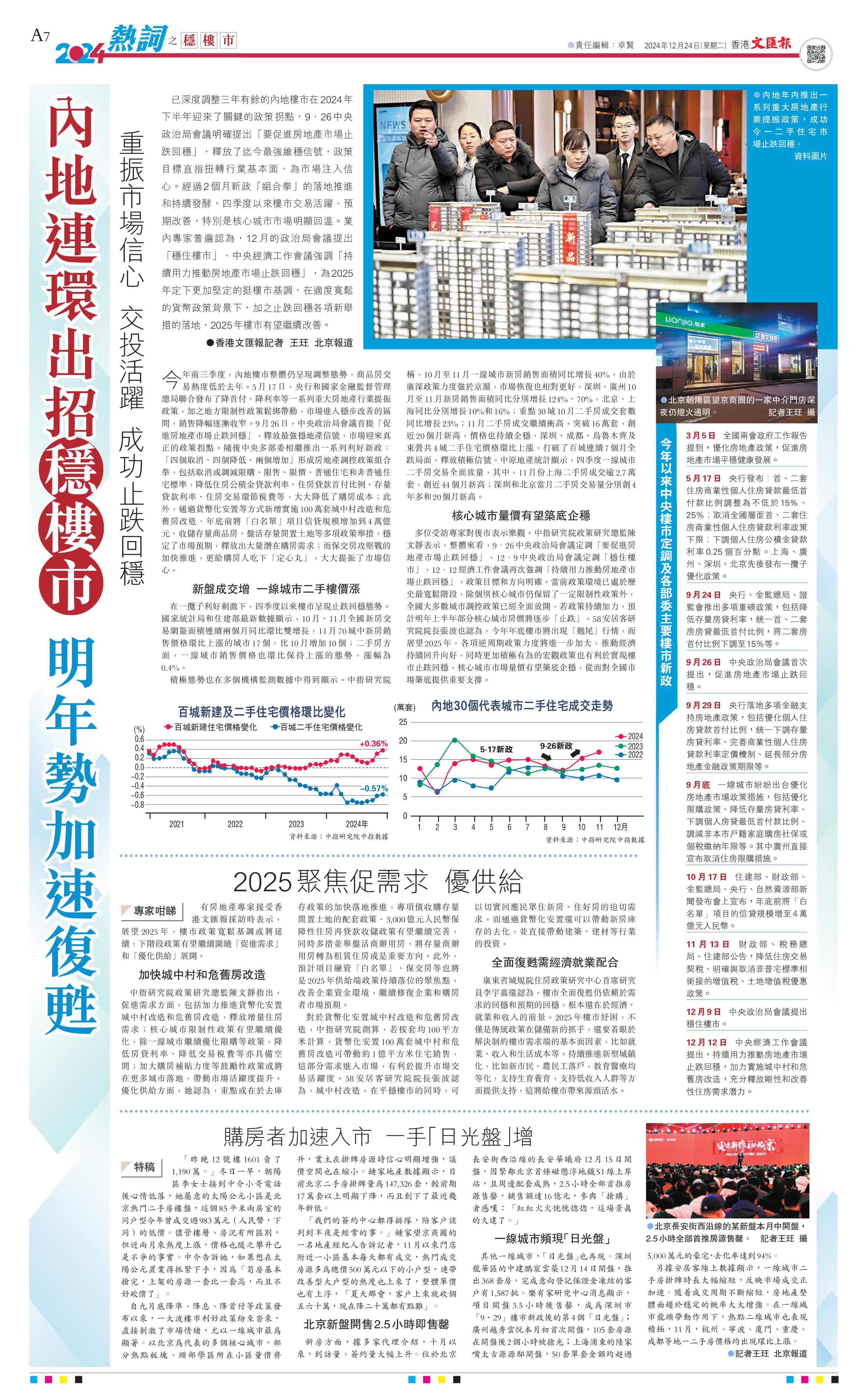 (香港文汇报记者 王玨 北京报道)已深度调整三年有余的内地楼市在2024年下半年迎来了关键的政策拐点,9·26中央政治局会议明确提出「要促进房地产市场止跌回稳」,释放了迄今最强维稳信号,政策目标直指扭转行业基本面,为市场注入信心。经过2个月新政「组合拳」的落地推进和持续发酵,四季度以来楼市交易活跃、预期改善,特别是核心城市市场明显回温。业内专家普遍认为,12月的政治局会议提出「稳住楼市」、中央经济工作会议强调「持续用力推动房地产市场止跌回稳」,为2025年定下更加坚定的挺楼市基调,在适度宽松的货币政策背景下,加之止跌回稳各项新举措的落地,2025年楼市有望继续改善。