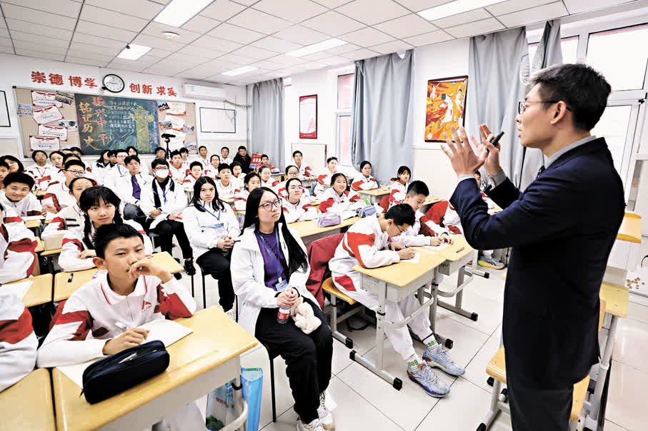 參訪團同學和人大附中分校的學生一起在課堂學習。 新華社
