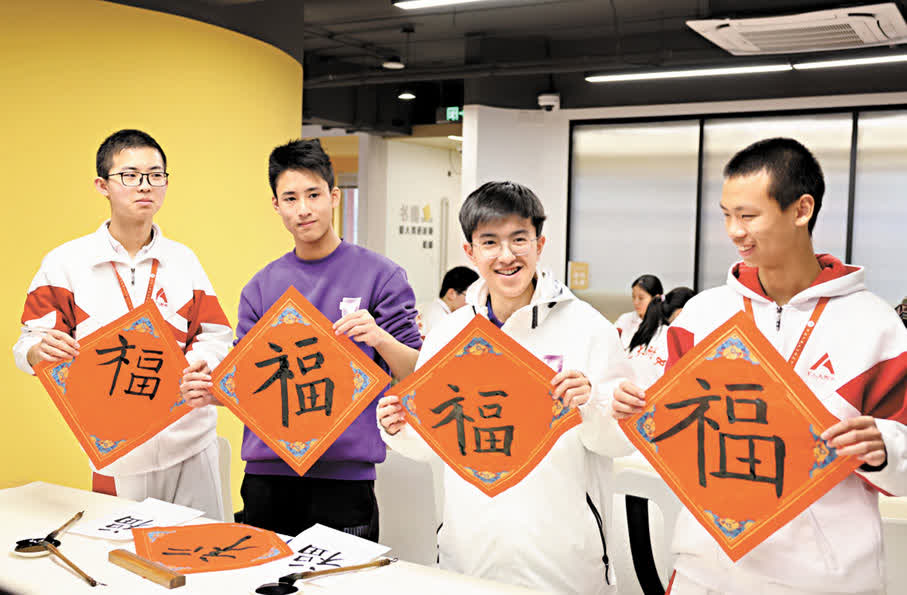參訪團的同學和人大附中分校的學生一起展示剛寫好的「福」字。 新華社