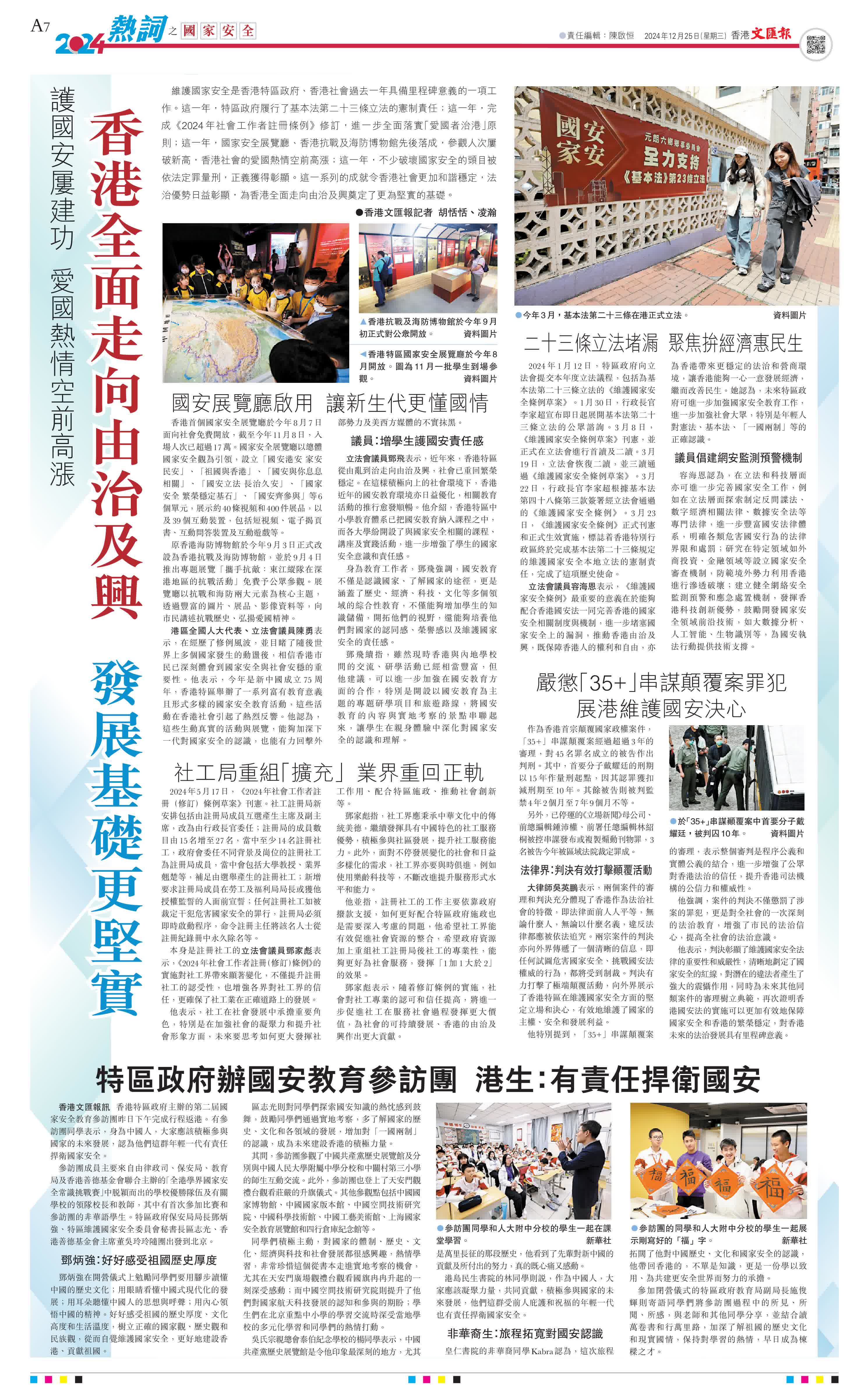 維護國家安全是香港特區政府、香港社會過去一年具備里程碑意義的一項工作。這一年,特區政府履行了基本法第二十三條立法的憲制責任;這一年,完成《2024年社會工作者註冊條例》修訂,進一步全面落實「愛國者治港」原則;這一年,國家安全展覽廳、香港抗戰及海防博物館先後落成,參觀人次屢破新高,香港社會的愛國熱情空前高漲;這一年,不少破壞國家安全的頭目被依法定罪量刑,正義獲得彰顯。這一系列的成就令香港社會更加和諧穩定,法治優勢日益彰顯,為香港全面走向由治及興奠定了更為堅實的基礎。