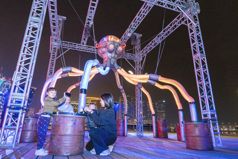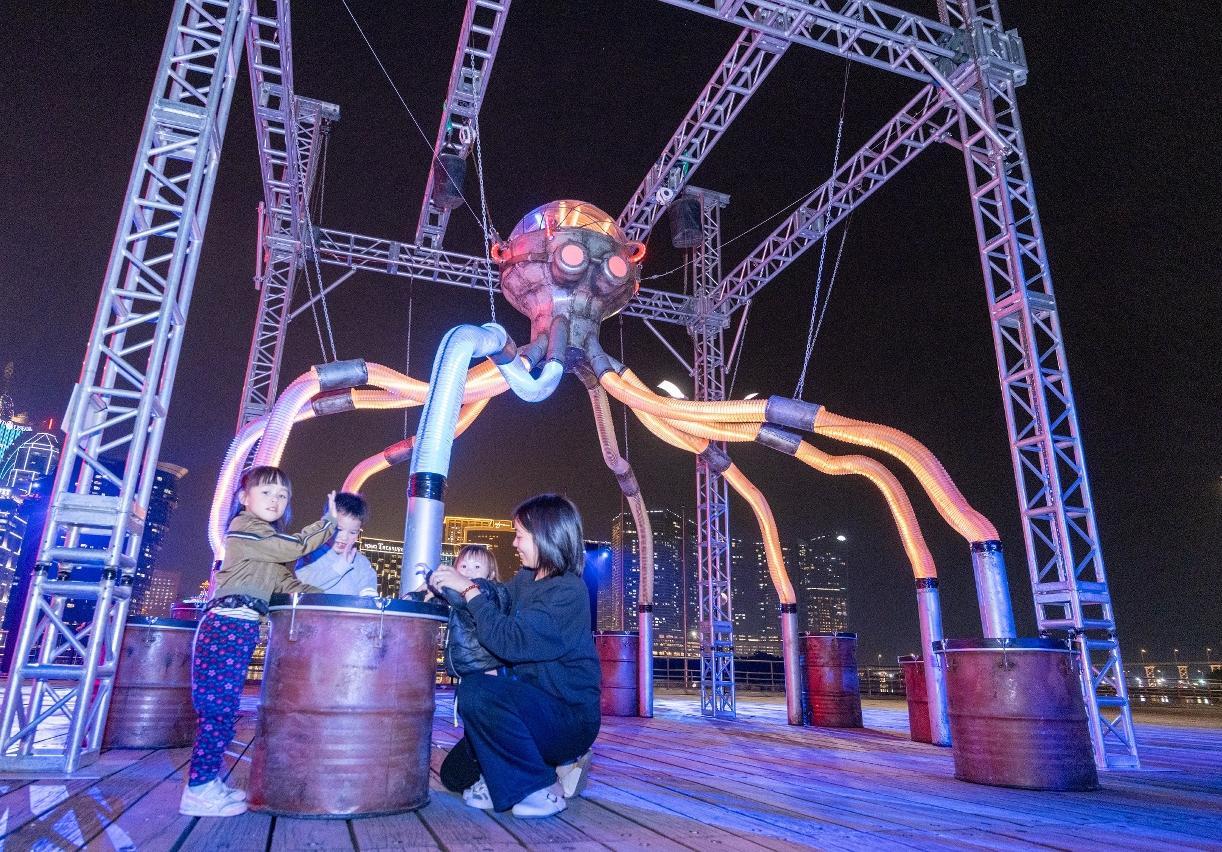 南湾区-「Octopoda」(互动装置):以章鱼为灵感,透过八个桶鼓让观众控制机械章鱼,提升对海洋生物多样性和生态保育的关注。