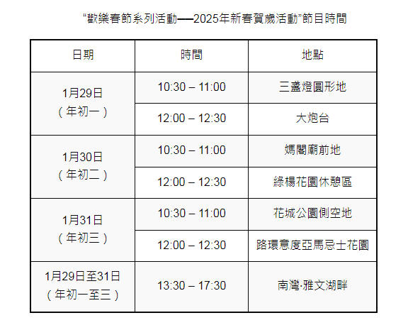 為與市民大眾喜迎新春佳節,文化局引進國家級品牌“歡樂春節系列活動──2025年新春賀歲活動”,於大年初一至初三期間(1月29日至31日)在澳門及離島各社區,為市民及旅客呈獻河北省及貴州省民俗特色表演及攤位展示,營造節慶氣氛,共賀新歲。
