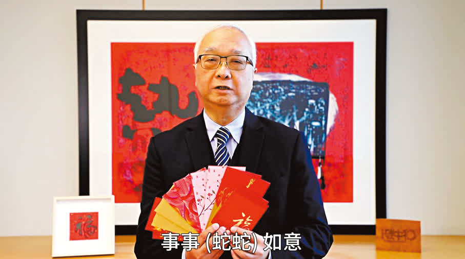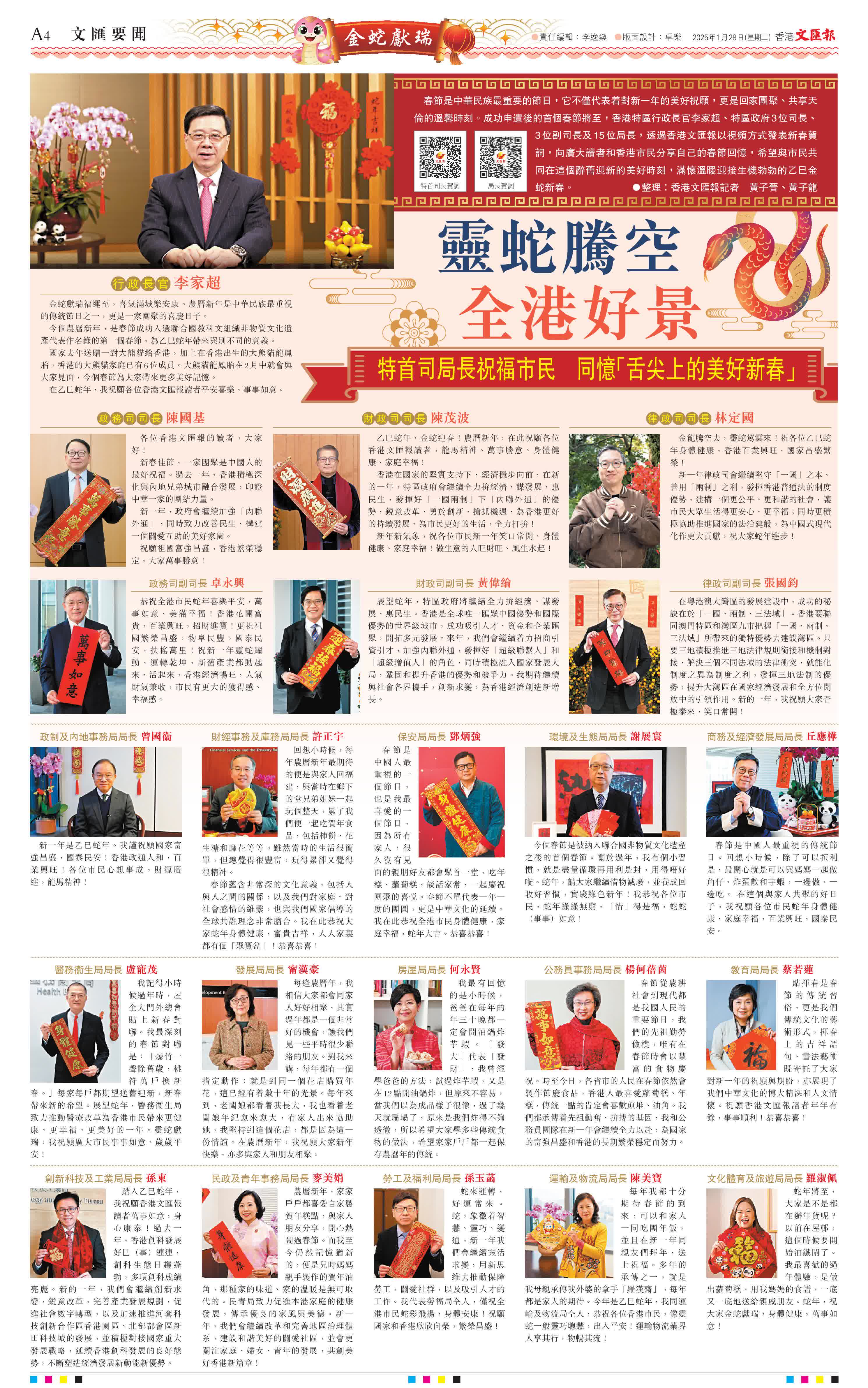 乙巳蛇年、金蛇迎春!农历新年,在此祝愿各位文汇报读者,龙马精神、万事胜意、身体健康、家庭幸福!香港在国家的坚实支持下,经济稳步向前,在新的一年,特区政府会继续全力拚经济、谋发展、惠民生,发挥好「一国两制」下「内联外通」的优势,锐意改革、勇于创新、抢抓机遇,为香港更好的持续发展、为市民更好的生活,全力打拚!新年新气象,祝各位市民新一年笑口常开、身体健康、家庭幸福!做生意的人旺财旺、风生水起!