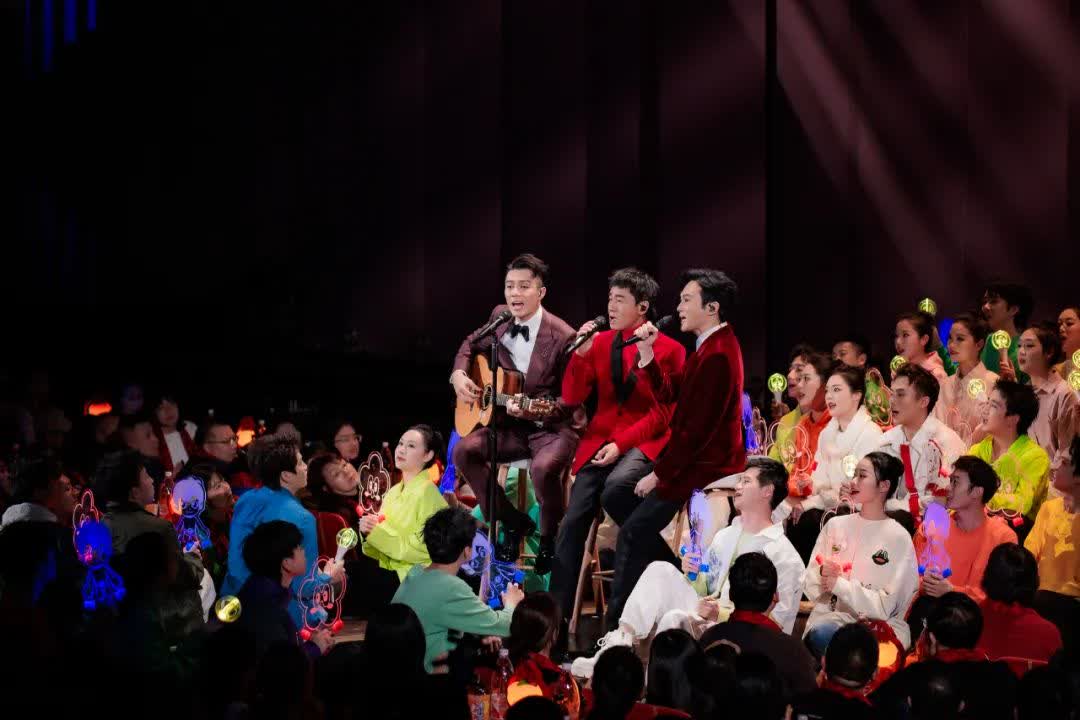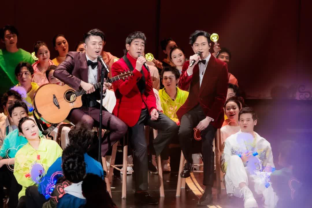 节目开场,三位男歌手坐在穿过观众席、通向主舞台的「如意柄」一端,营造不插电演唱会的感受,身边亲密簇拥的人群,正符合粤语金曲与观众零距离的特质。