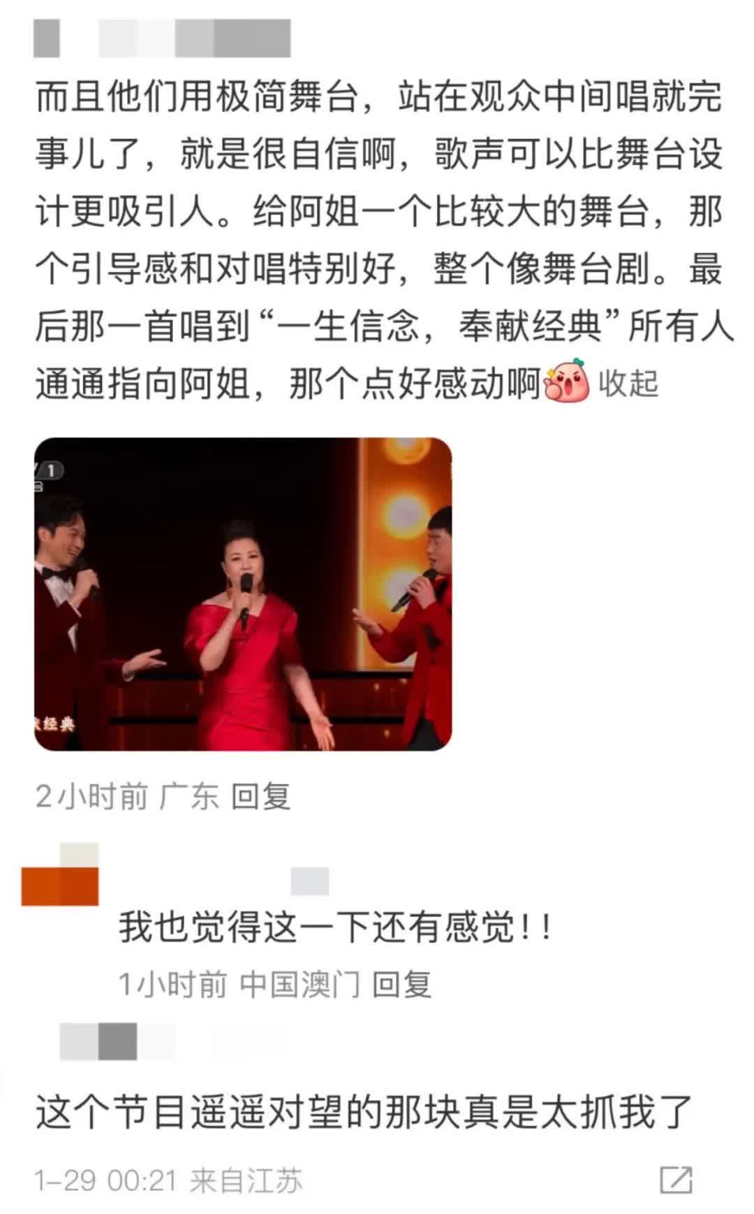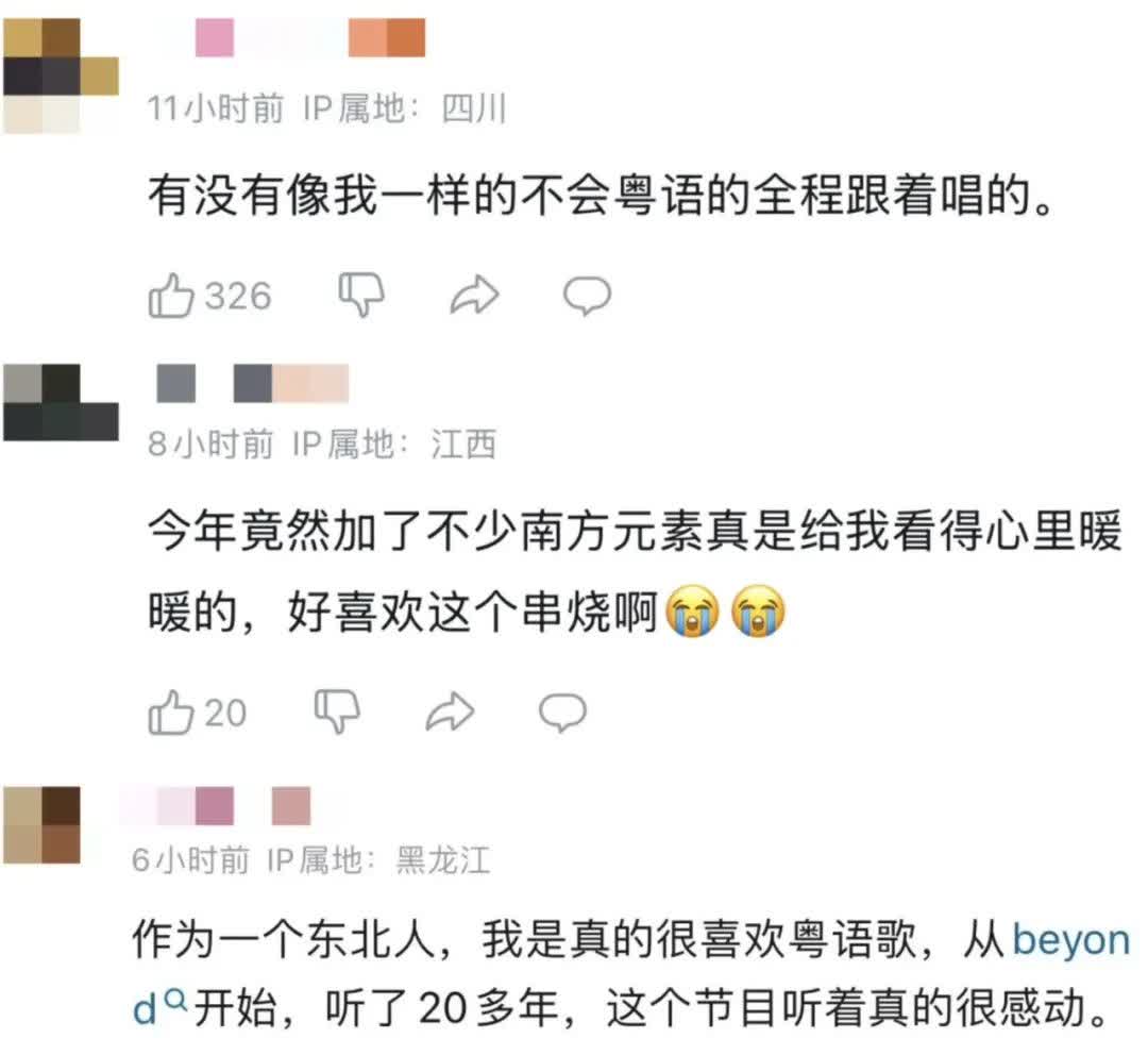 创作团队不断在港风回忆和当代传唱之间,体会不同作品的情感适配度,提炼粤语老歌直击人心的蓬勃生命力。当耳熟能详的《海阔天空》《男儿当自强》《红日》《万水千山总是情》《沧海一声笑》在除夕之夜唱响时,「过瘾」「尽兴」成为许多观众最大的感受。