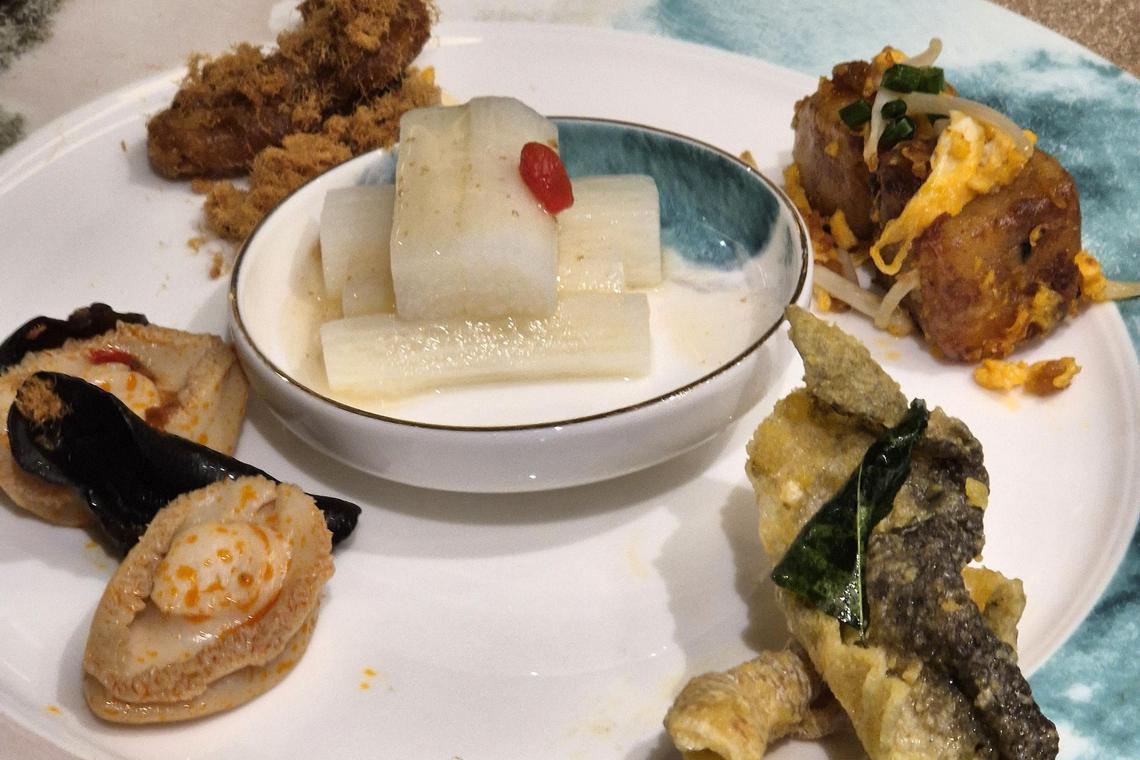 五彩迎宾前菜有香酥肉松茄子、冰镇淮山、黄金腌制小鲍鱼、咸蛋黄香脆鱼皮、XO酱炒萝卜糕。炖汤可选含小鲨翅的鲨鱼骨胶原炖汤或酸辣汤。