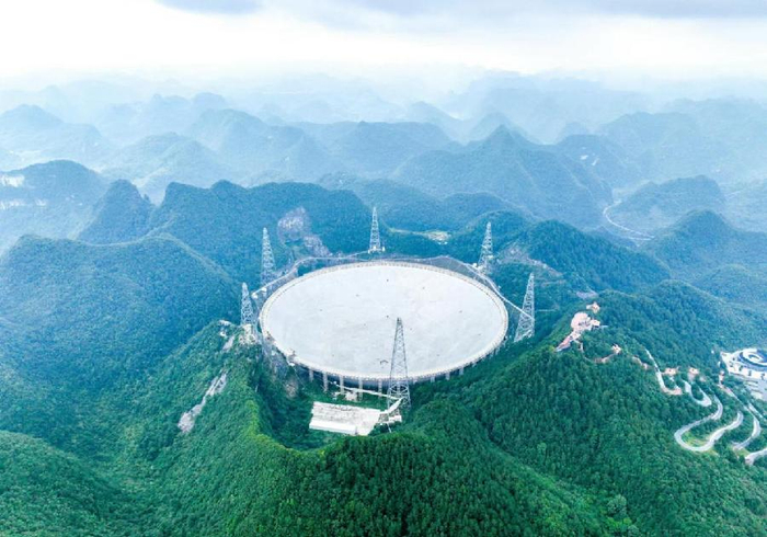 在平塘天眼所在的群山中,500米口径的球面射电望远镜,如银色巨碗倒扣,将人类对宇宙的好奇收纳进这片纯净的夜空。