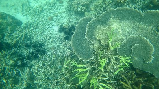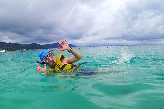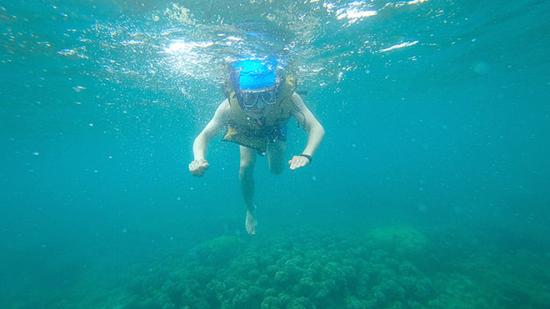 沙比岛海水清澈,浮潜可以看到很多鱼群和珊瑚,上一次我在这里浮潜时还看到了小丑鱼。而这次因为天气突变,蓝天变乌云,水下能见度差了,也没时间去寻找小丑鱼,只看到了很多的海胆和小鱼群。