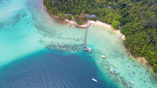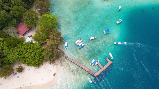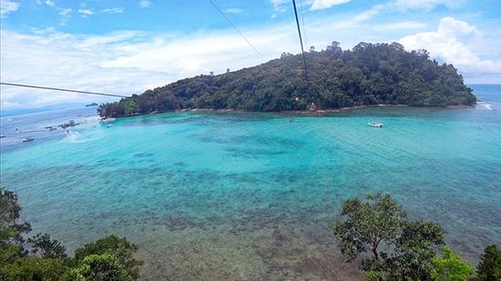 这是相邻的加雅岛,从空中看,海水质量也是非常好的。玩“凌空滑索”项目,需要从沙比岛乘船到加雅岛,从这个码头上岸。