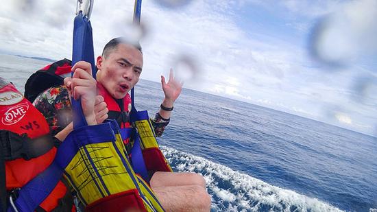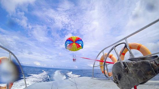 之前有在三亚玩过拖伞,基本上只是放到空中随着快艇的速度前行,时尔上升或下降,即使玩“蜻蜓点水”,也是很轻微的。然而这此在沙比岛,基本上全程都是在“蜻蜓点水”,整个腿都会淹没在海水中,玩过以后基本上全部湿身了,然而正是这样的拖伞才更刺激更好玩不是吗?