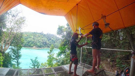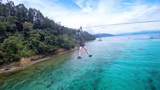 嗖的一声就完成了两座海岛之间的跨越,时速六十公里的疾驰,凌空飞越海面冲到沙比岛,是不是非常刺激。最重要的是,在这个短短的过程中还能从空中欣赏到脚下蓝色的海景以及远处的亚庇城市景观。