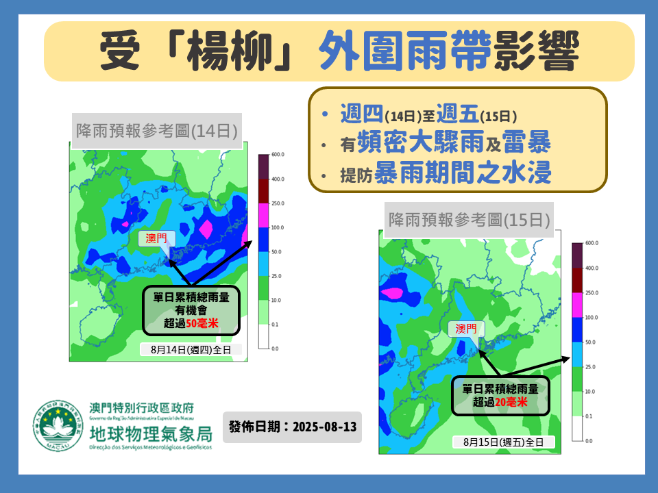 氣象局續稱,受「楊柳」環流影響,週四(14日)至週五(15日)初時,本澳會有頻密大驟雨及雷暴,並伴有強烈陣風,低窪地區可能因短時強降雨出現水浸。呼籲巿民留意最新天氣資訊,並適時做好應對措施。