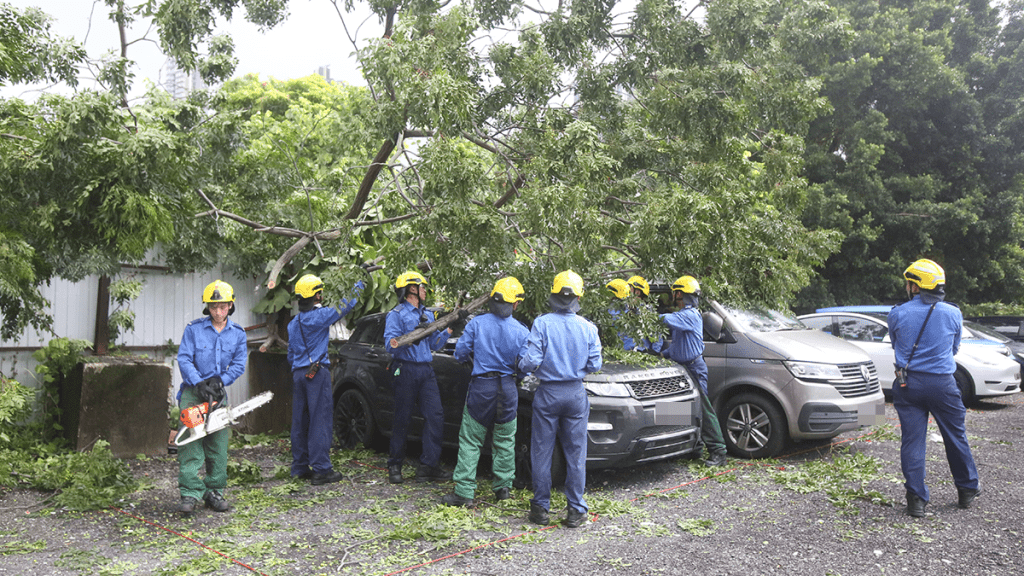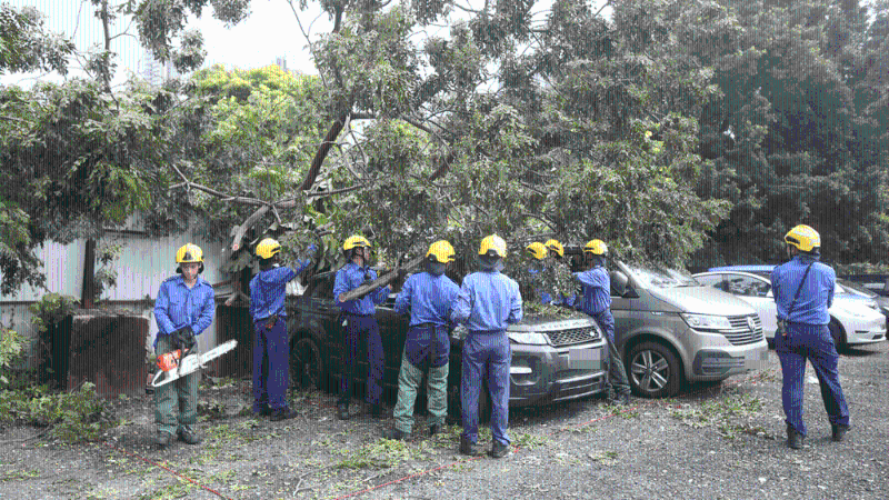 台风“塔巴”逐渐远离香港,但多处依然吹烈风。(9月8日)下午2时52分,油塘茶果岭道港铁油塘站B2出入口对开一个露天停车场,一棵大树不敌强风吹袭倒下,砸中5辆私家车,有车辆的车顶更被大树砸至凹陷。救援人员到场,经搜索后证实无人受伤,其中3辆车可以实时驶走离开,余下两车需有待消防清理树枝才可驶离。