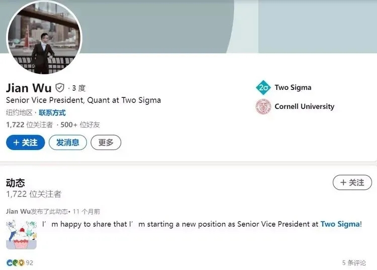 据悉,吴舰在2011年取得了清华大学的工学学士学位,并于2017年从美国康奈尔大学获得了哲学博士学位,曾在知名投资机构Citadel实习,2018年进入量化基金巨头Two Sigma任职,三年内火速升任副总裁。2023年1月,工作不到5年的吴舰更被提拔为高级副总裁。(Two Sigma为全球最具规模的量化对冲基金之一,长期以数学模型与演算法驱动投资决策。)