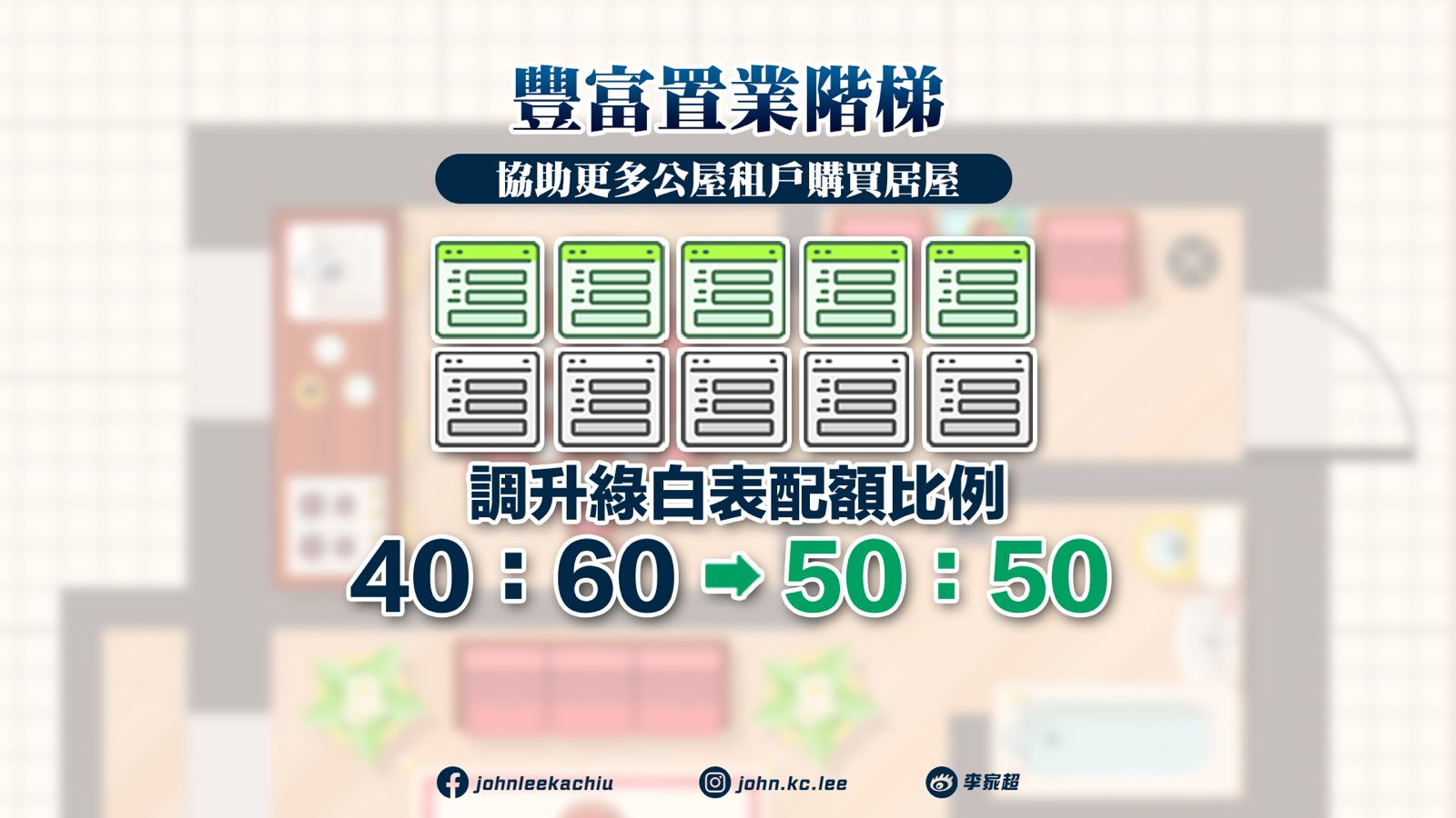 行政長官李家超今日(17日)上午11時在立法會發表任內第四份施政報告,他宣布六項豐富置業的措施,包括將綠白表配額比例由40:60調升至50:50